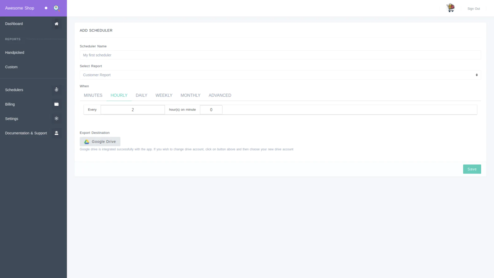 Schedule reports to be exported automatically to your google drive account. Specify custom time intervals for regular exports.