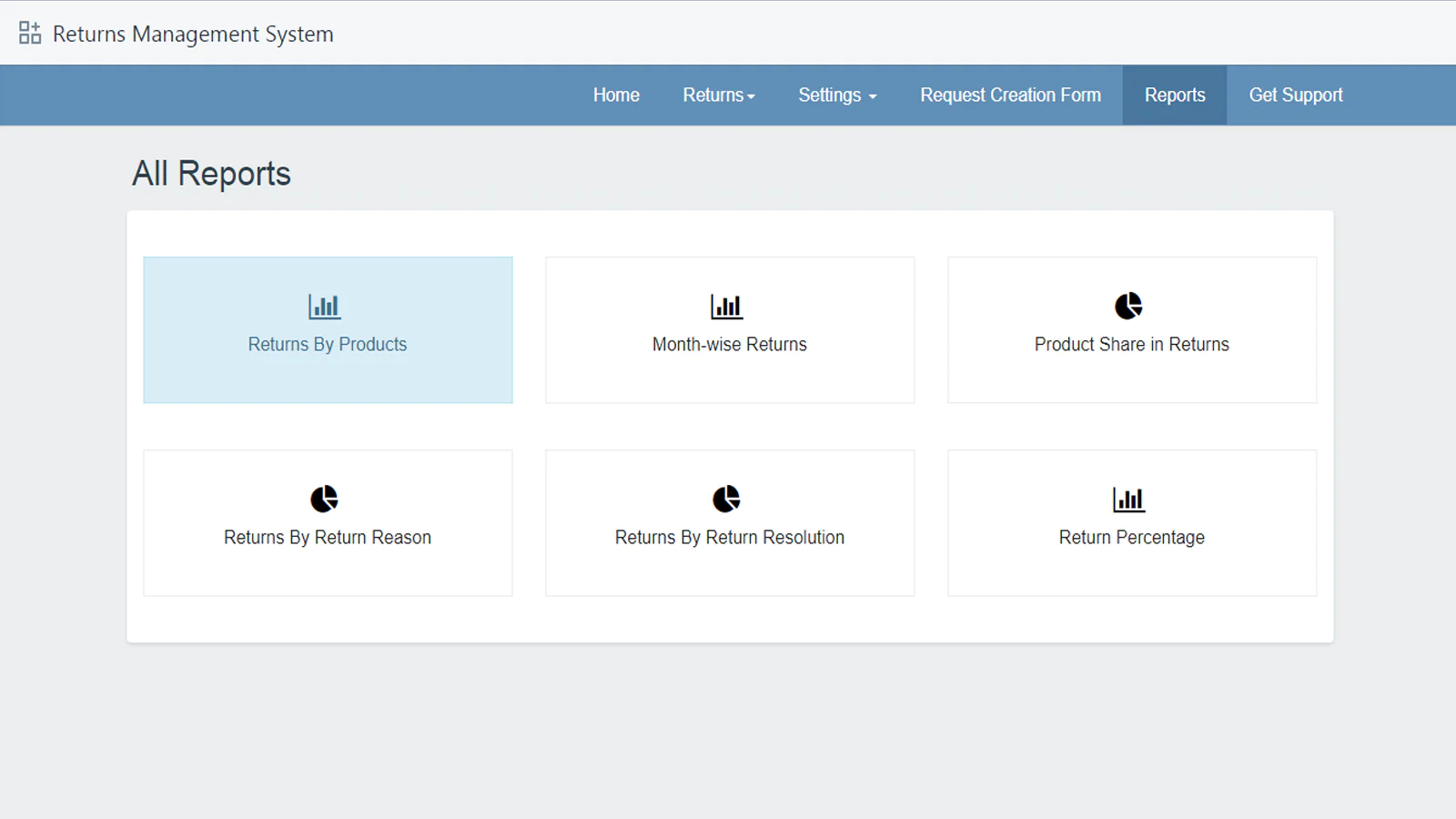 Reports include Most Returned Products, Return Percentages etc. These Reports provide actionable insights to reduce costs and improve profitability.