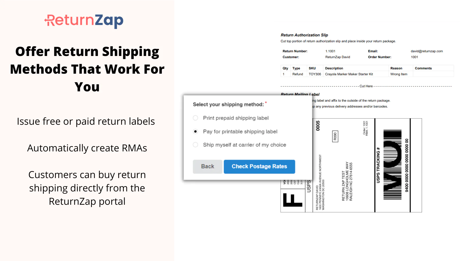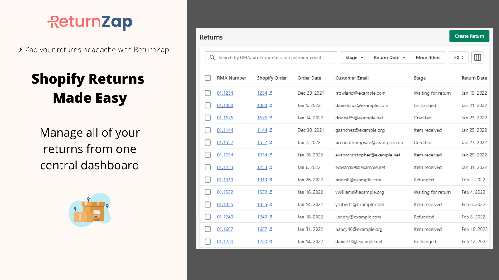 Customer returns are a necessary part of running an ecommerce business. But they don't have to be painful. ReturnZap gives you the tools to provide a great customer returns experience, build repeat business, and create customers for life.