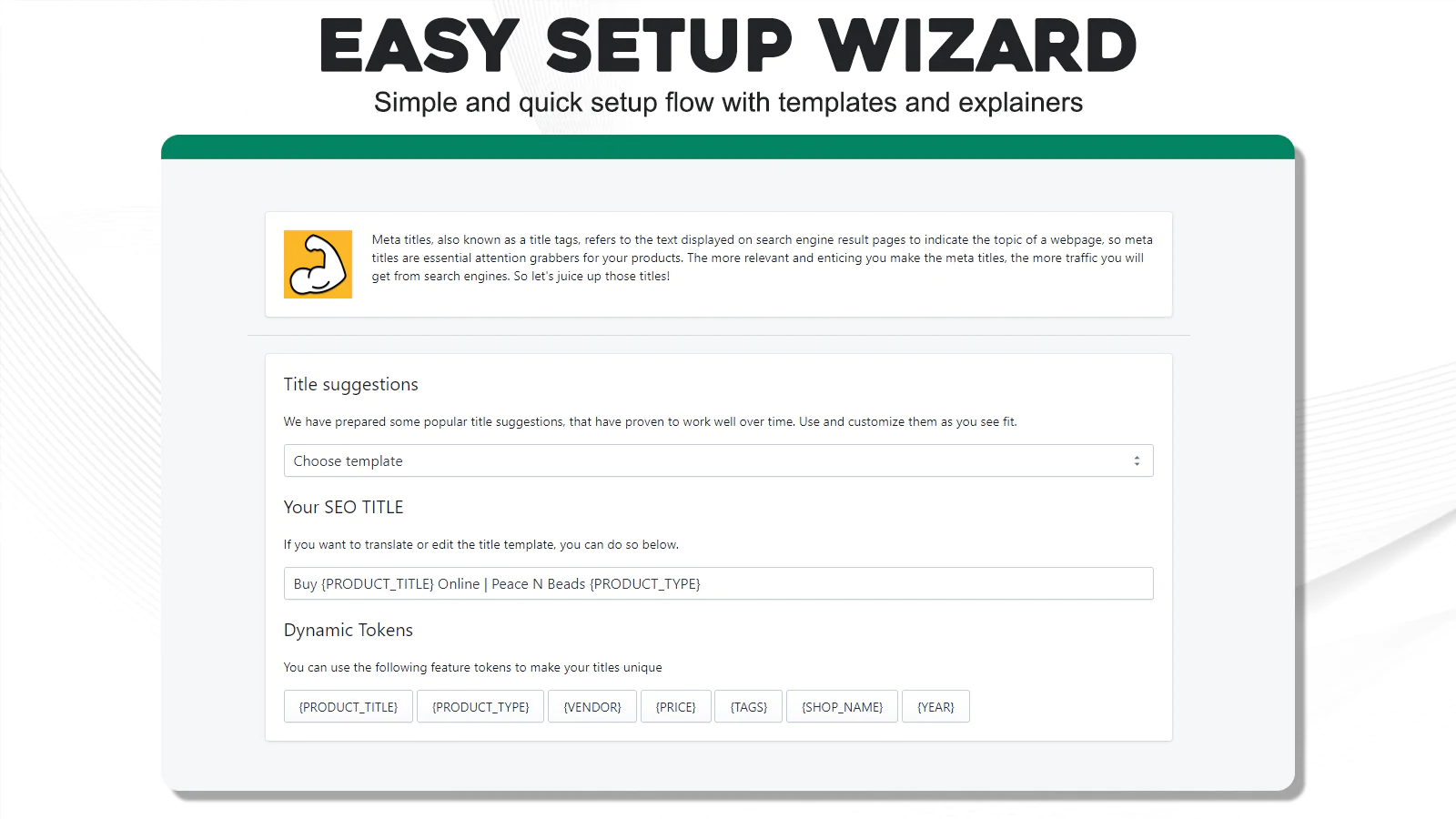 By using product keywords as tokens, the app follows customizable templates to make compelling and relevant SEO meta data that search engines LOVE.