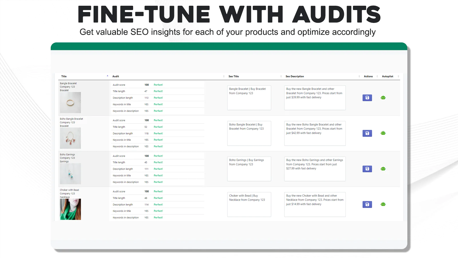 While Strong SEO automatically handles the time consuming and repetitive SEO tasks for you, nothing beats a human touch. That’s why we developed Product SEO Audits, a section where you can monitor the SEO rating for each of your products and make changes directly, if needed.