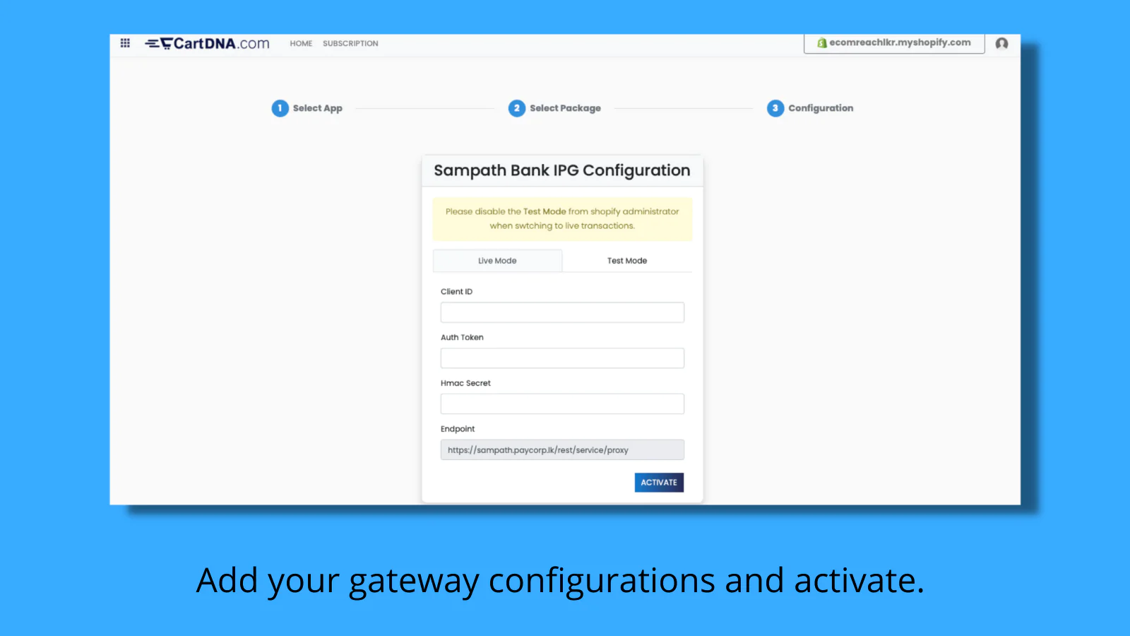 Enable "TEST mode" on the Shopify Sampath Bank IPG gateway management section.