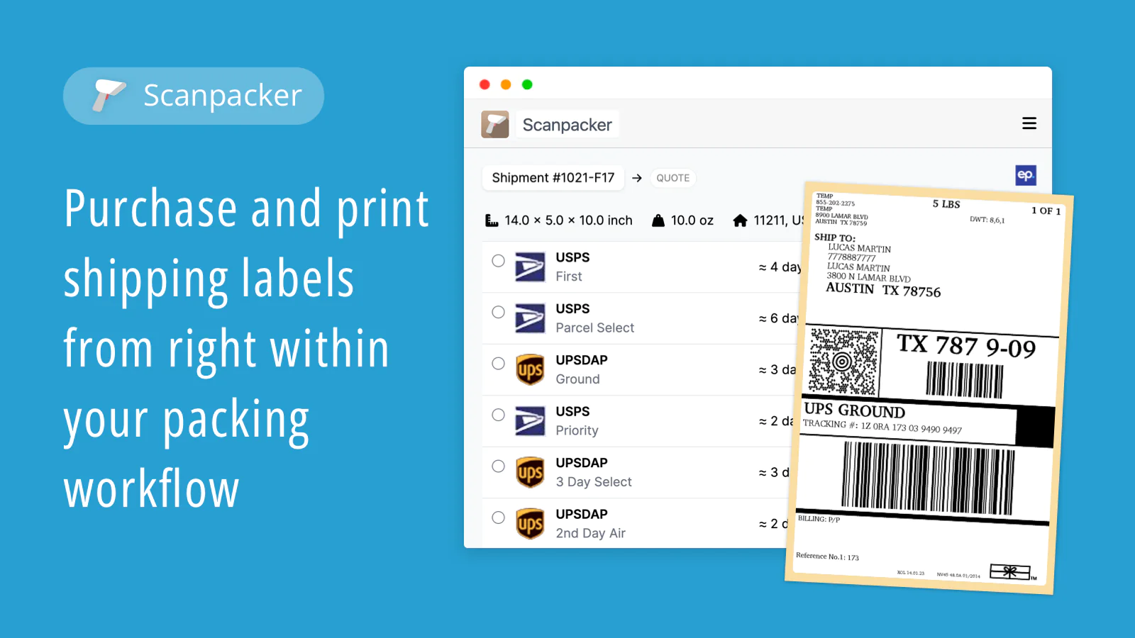 Shipping label purchase : Automatically purchase and print postage right within the packing workflow.
