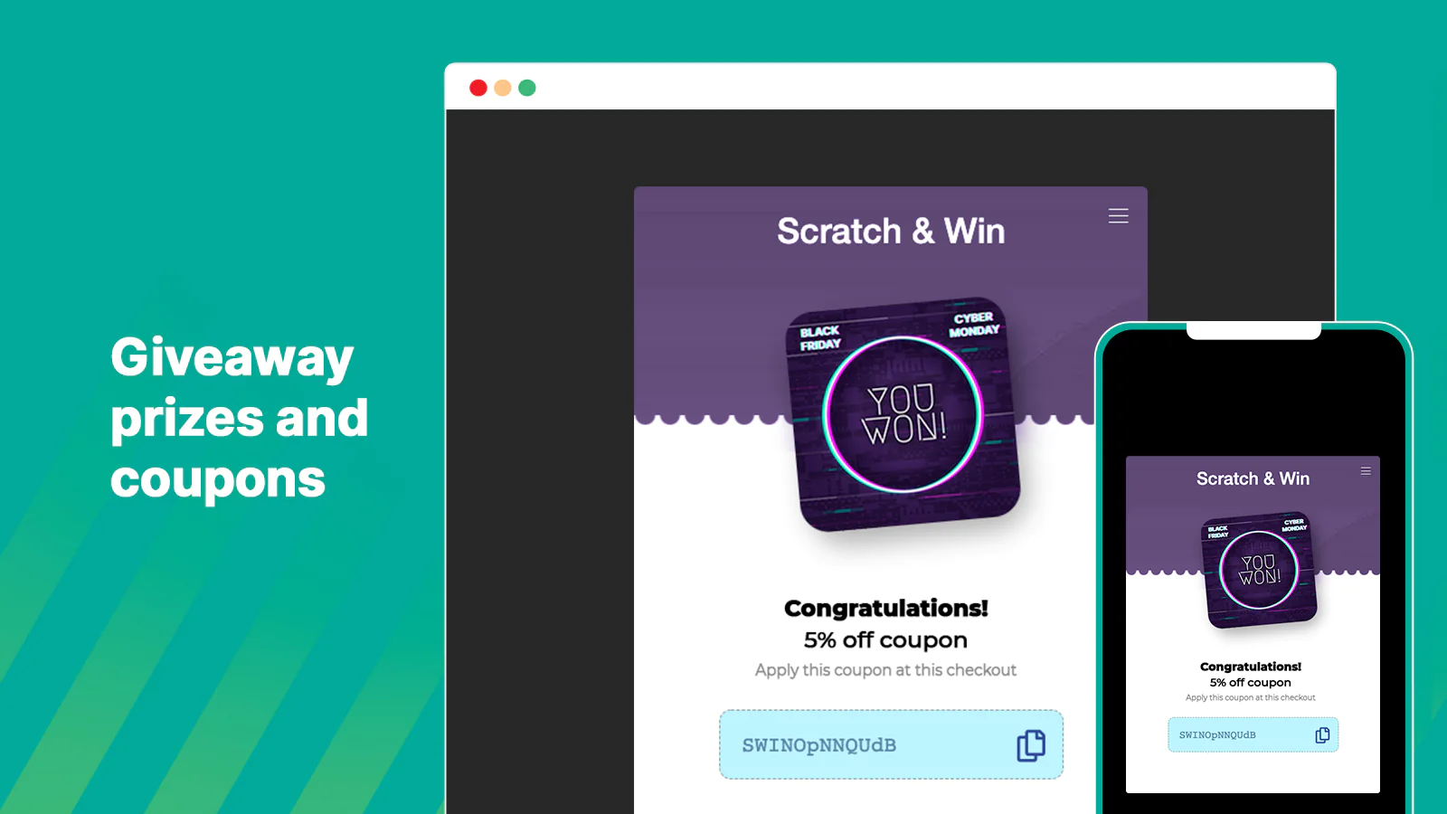 Display a Scratch Card on your website. Give visitors a chance to win in return for entering their details. A fun and irresistible way to get leads, fans, repeat visits, lists, referrals and sales ( Yes! Winners can immediately apply their coupon codes at checkout- This means more sales for you)