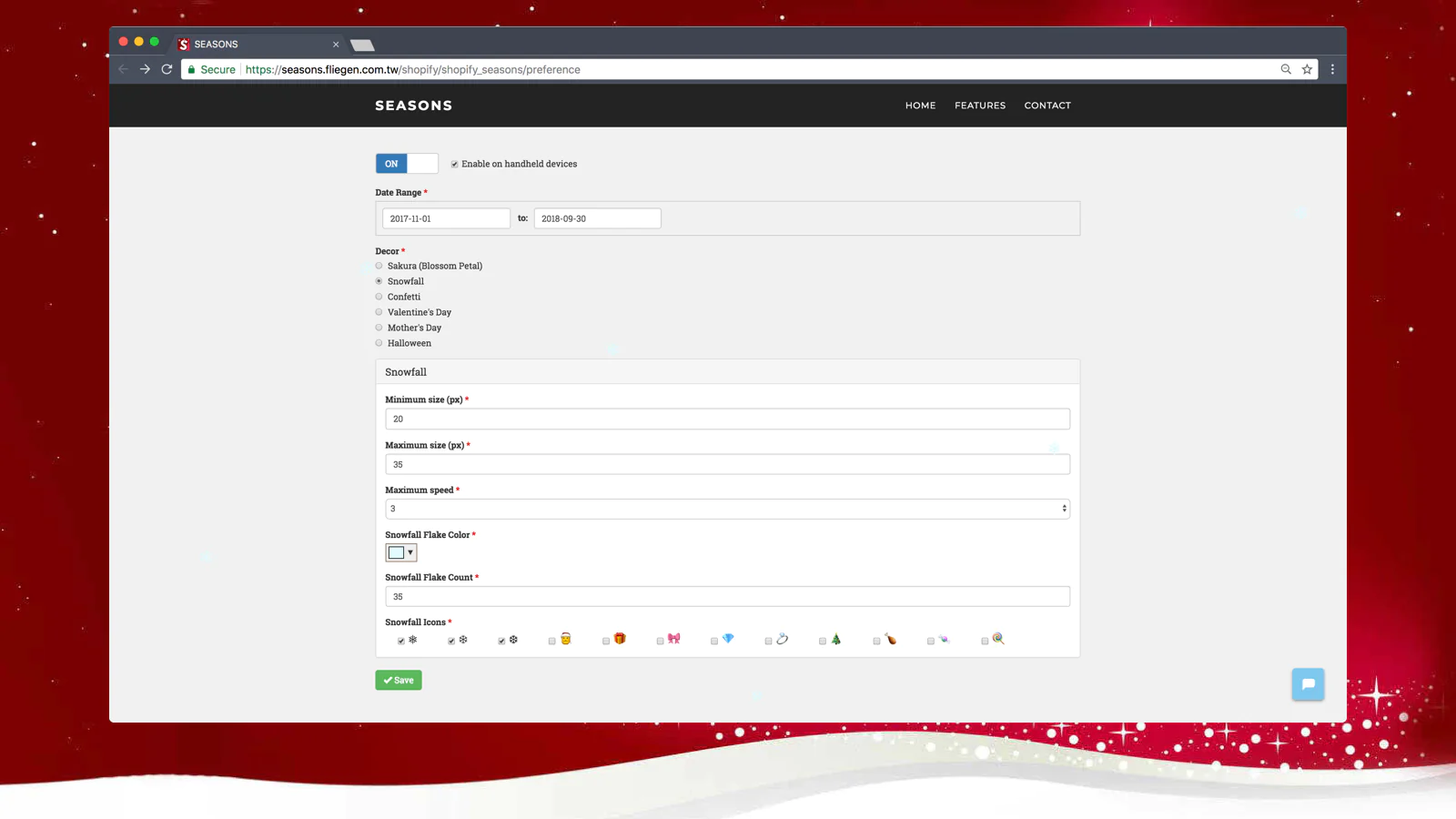 Seasons is not only easy to install but also simple to configure. You can manually turn the effects on and off by a simple switch, or just calendar the start and end dates in advance. The effects will automatically apply on both desktop and handheld devices, but you can also disable it on mobile! The best thing is you can customize the decorations as you like, such as falling speed, size, color...etc.