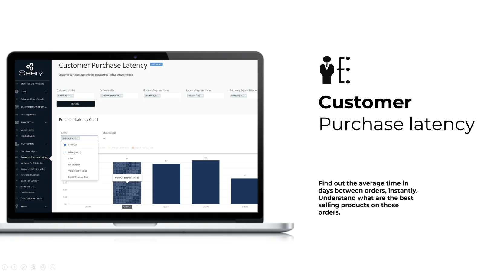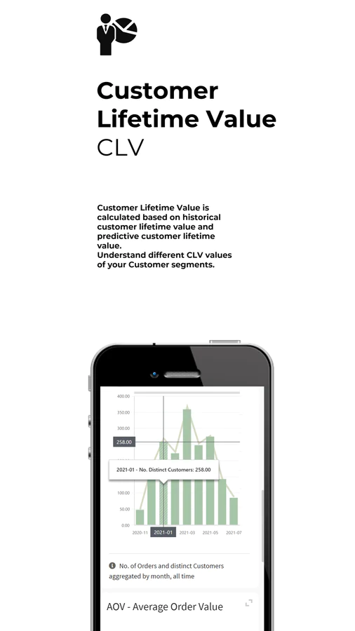 KPI, CLV, Cohorts, Latency ... : Track the most important KPIs like Customer Lifetime Value (CLV), Avg Order Value (AOV), Time in days between Orders, Retention % ...