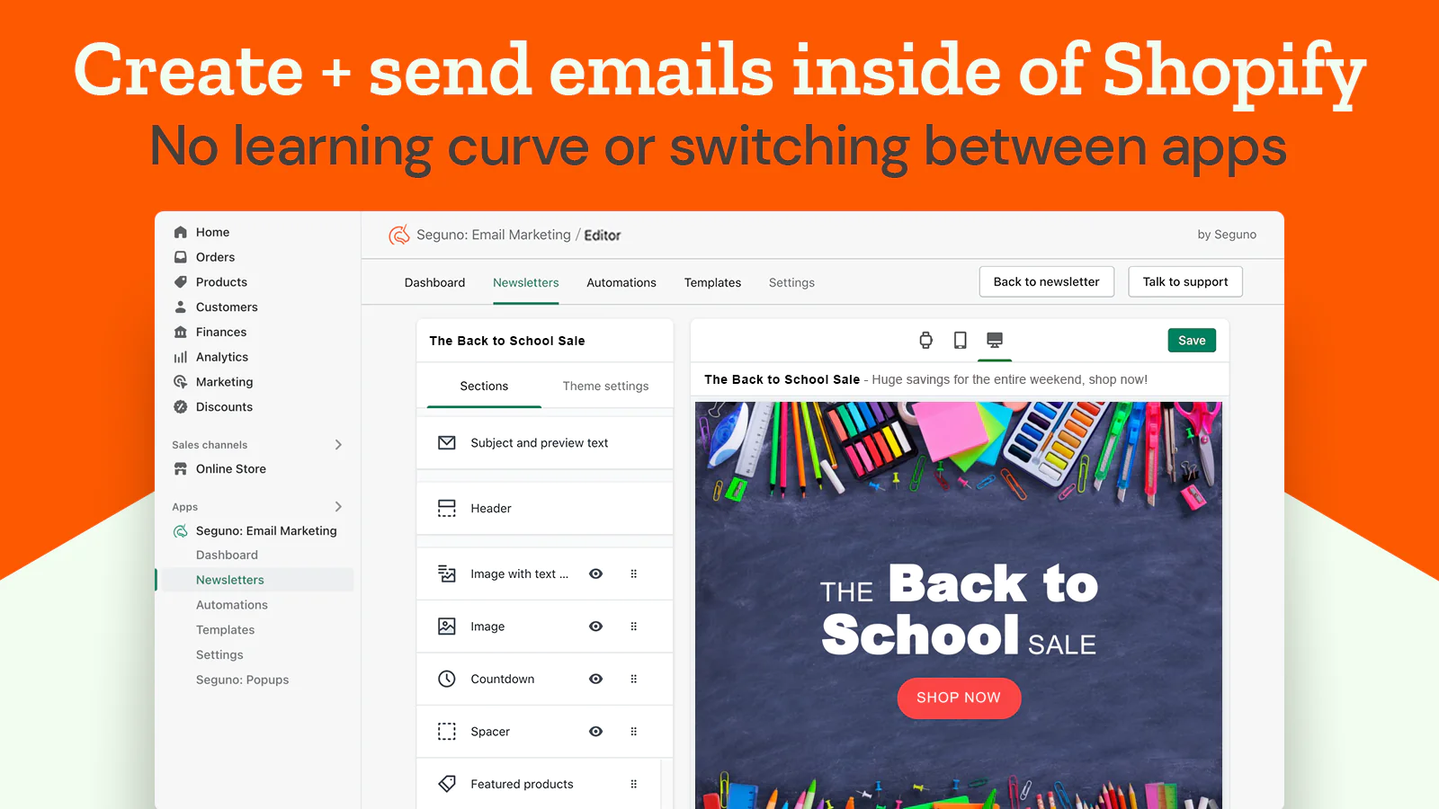 Create, manage, and track your email marketing — without leaving Shopify.