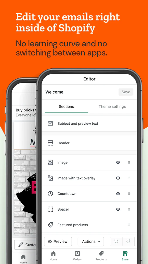 Feel at home inside Shopify : Email marketing right inside your Shopify Admin, Mobile App, and Marketing campaigns. Design emails in minutes, no scripts or theme mods.