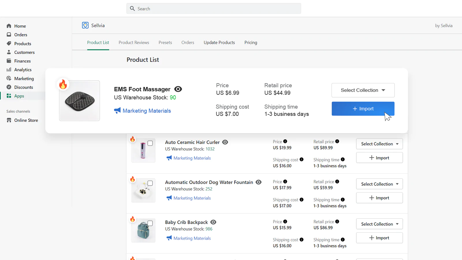 Import Sellvia products : Each product goes with a compelling description, quality visuals, and real-life reviews. The access to Sellvia catalog is unlimited.