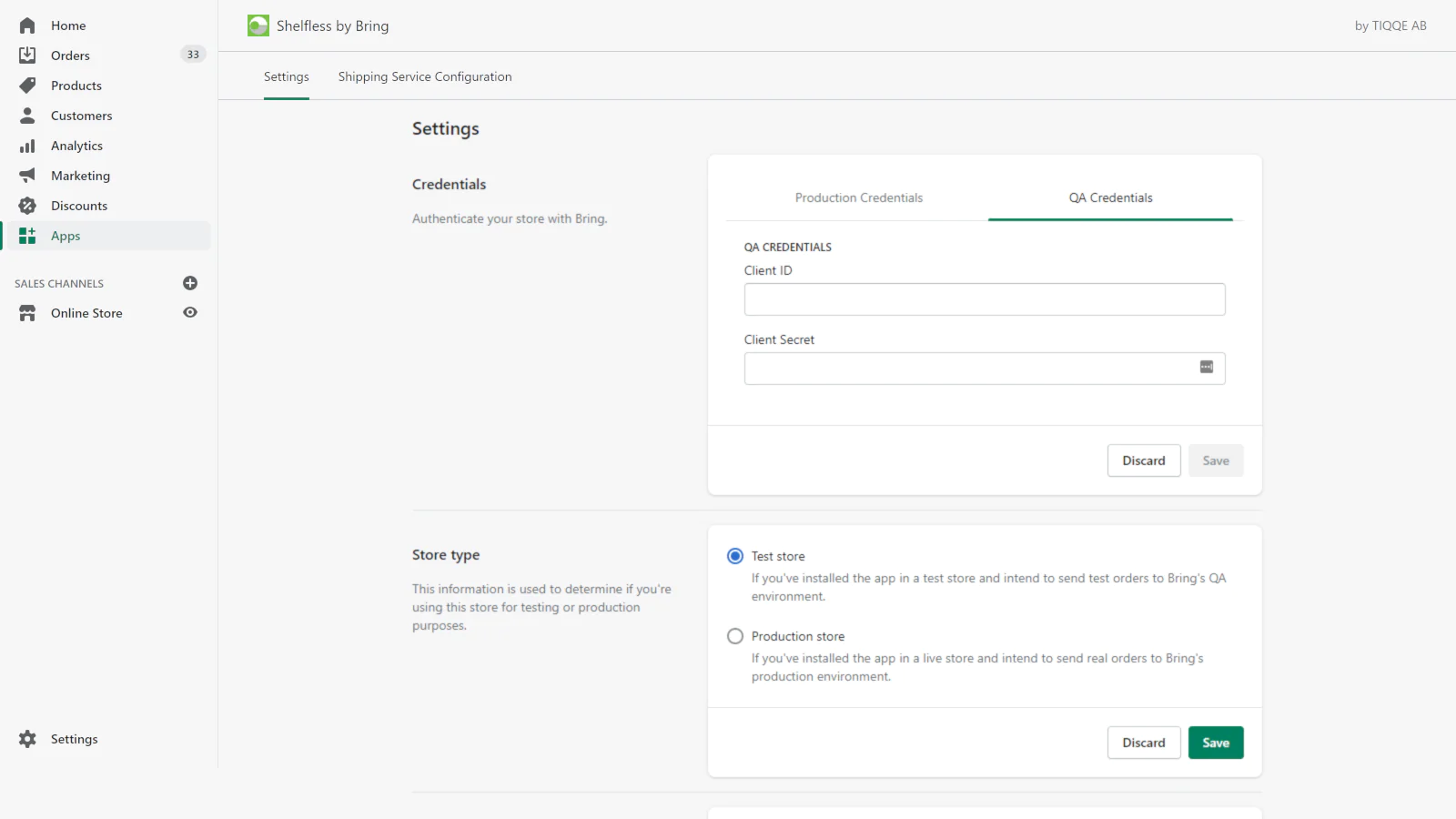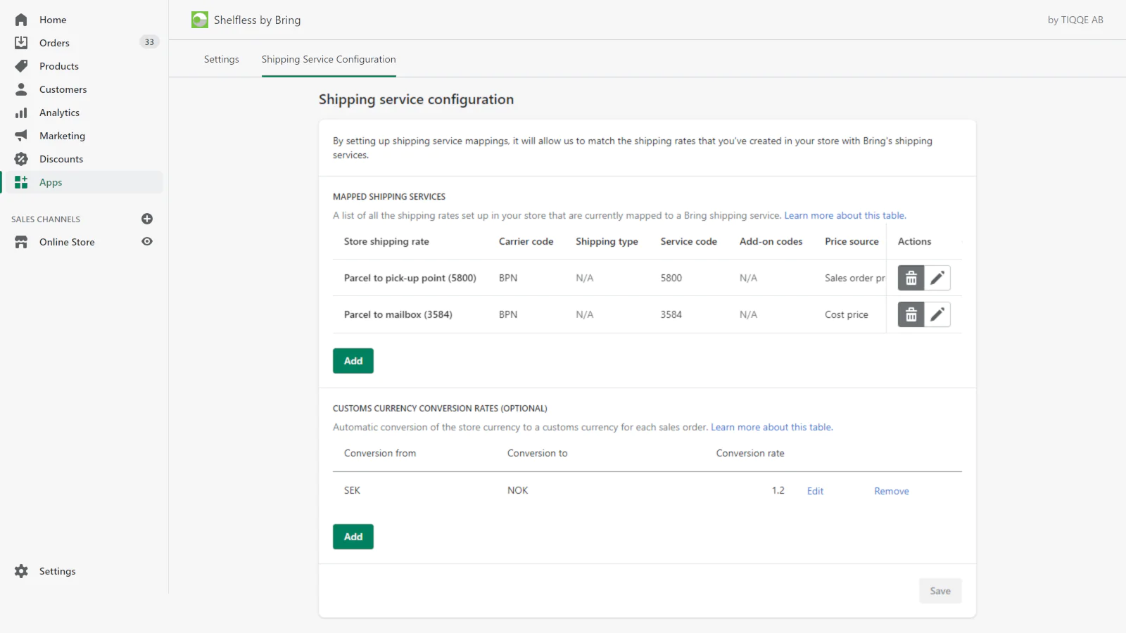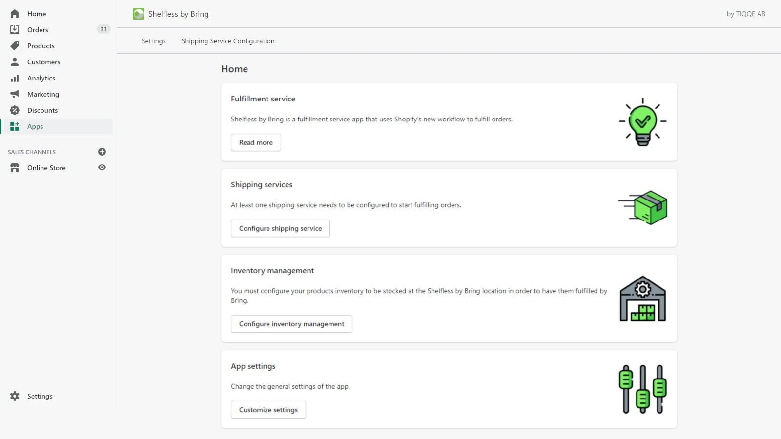 The app enables you, as a Shelfless by Bring customer, to use Shopify to fulfill your orders. The app enables you to offer flat rate shipping and to manage your orders via Shelfless by Bring app.