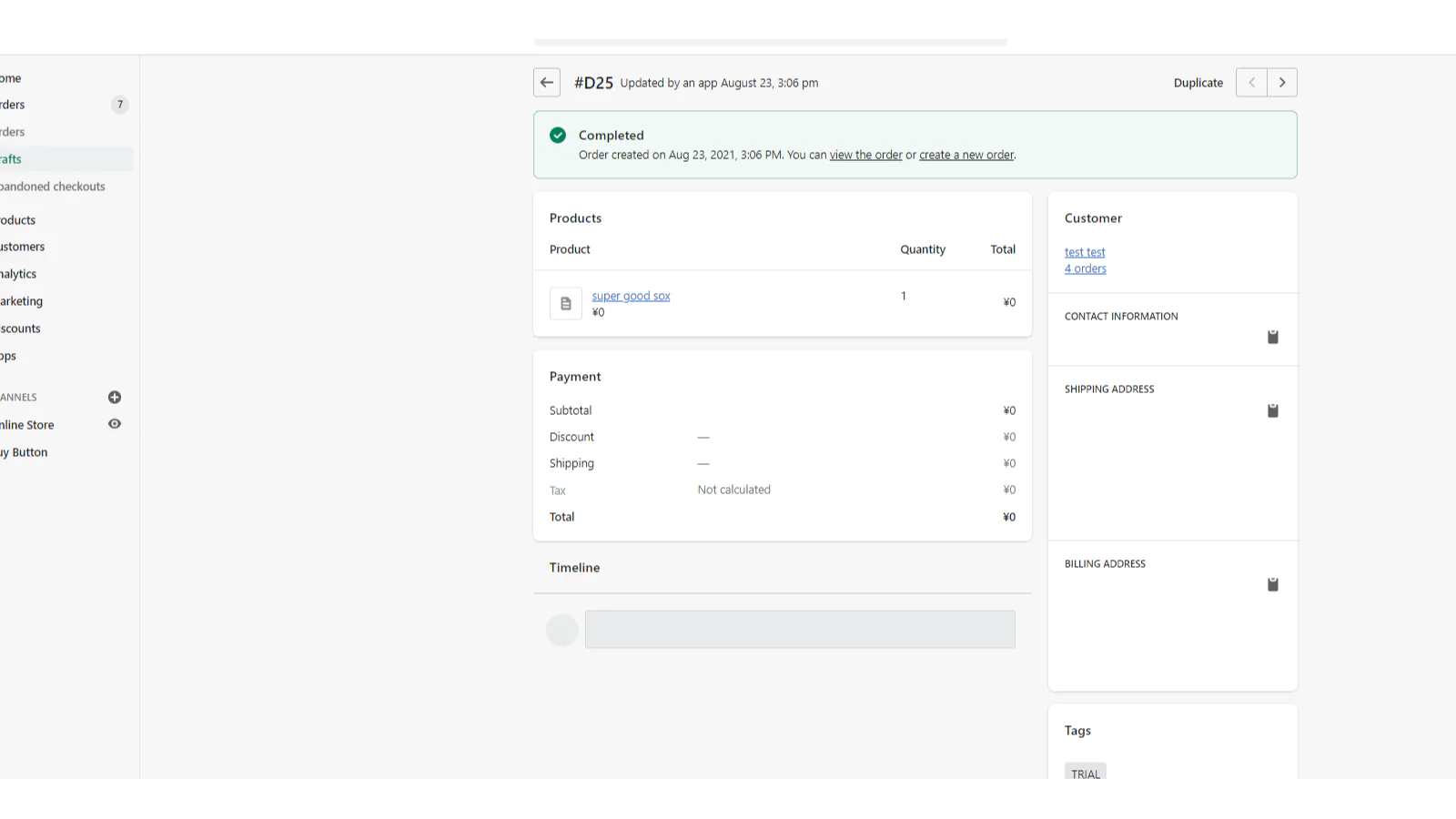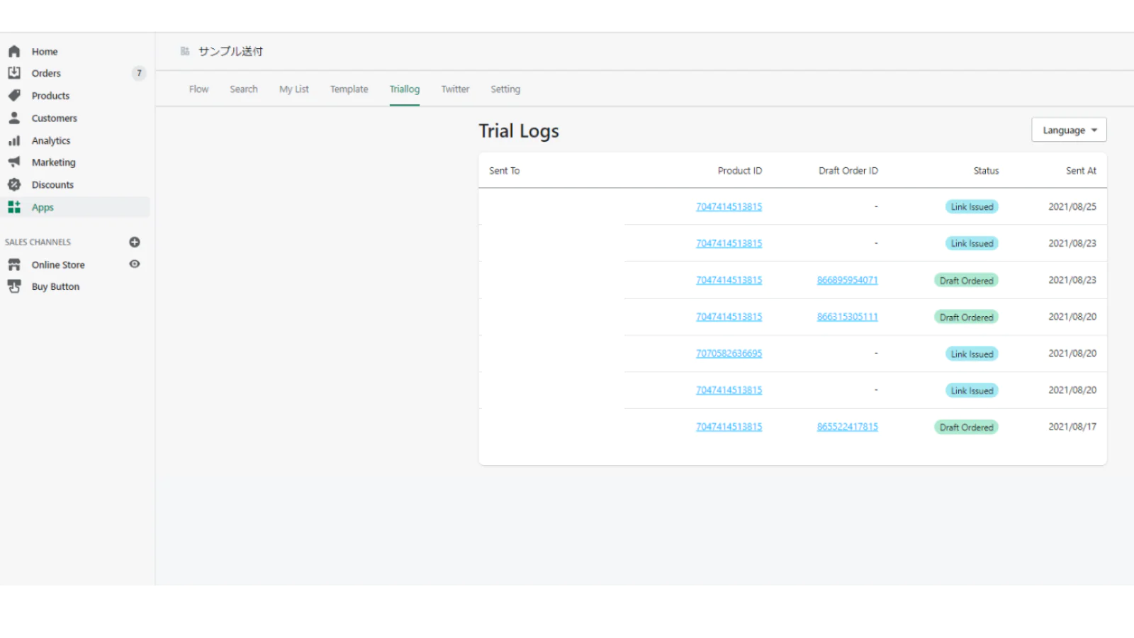 The information of the user who registered the shipping address from the issued link will be registered in Shopify's customer management screen, and the request to send samples will be registered in the draft order.