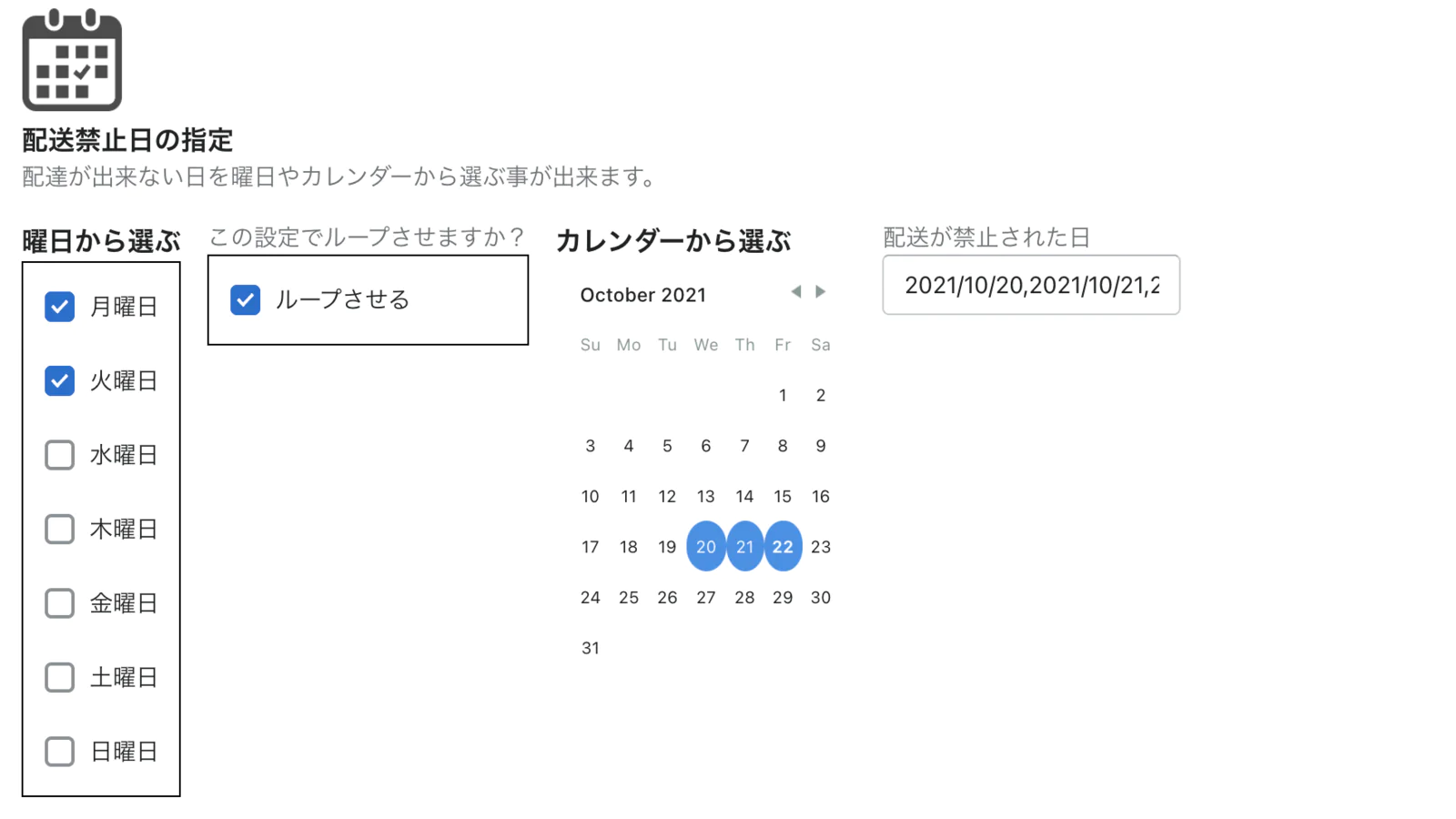 Set delivery prohibited days : Specify the delivery prohibition date from the day of the week. Delivery prohibited dates are configurable from the calendar.