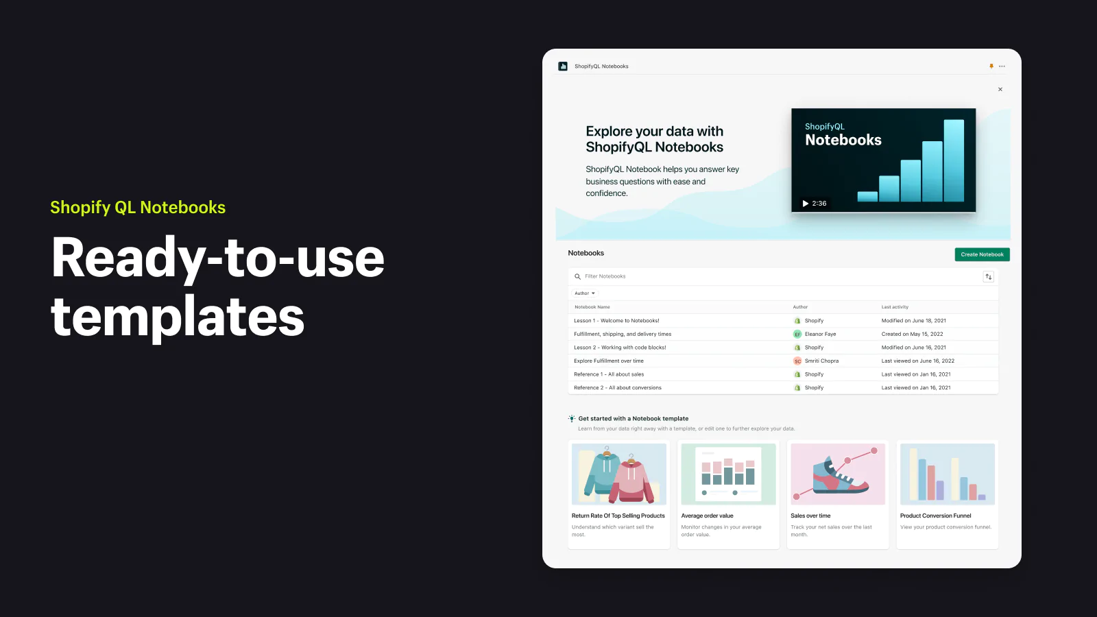 ShopifyQL Notebooks help you bring together metrics from different business domains so you can explore, visualize and analyze shop data to make better business decisions. Your data exploration is guided by ShopifyQL - an intelligent query language that has commerce syntax built into it. You can now write simple queries to quickly get access to data and add business context via images or text, all within a single interface.