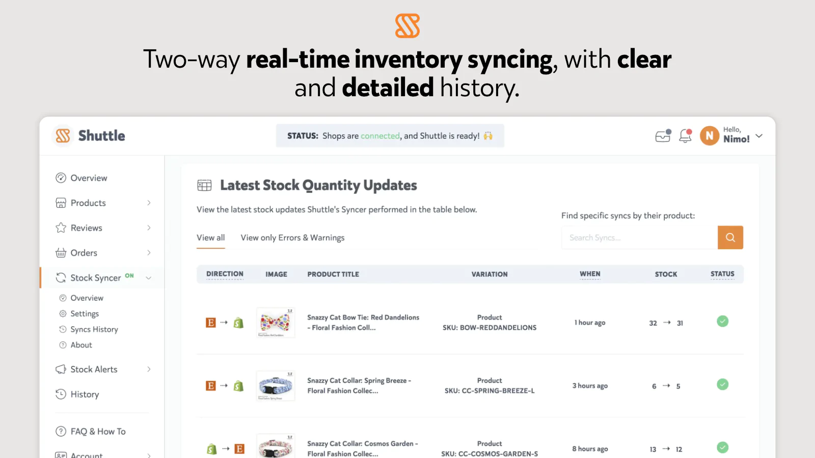 Shuttle can automatically transfer freshly received orders & reviews, and newly created products. It will also notify you when products are low in stock, and of-course – automatically maintain a real-time sync of your stock levels.