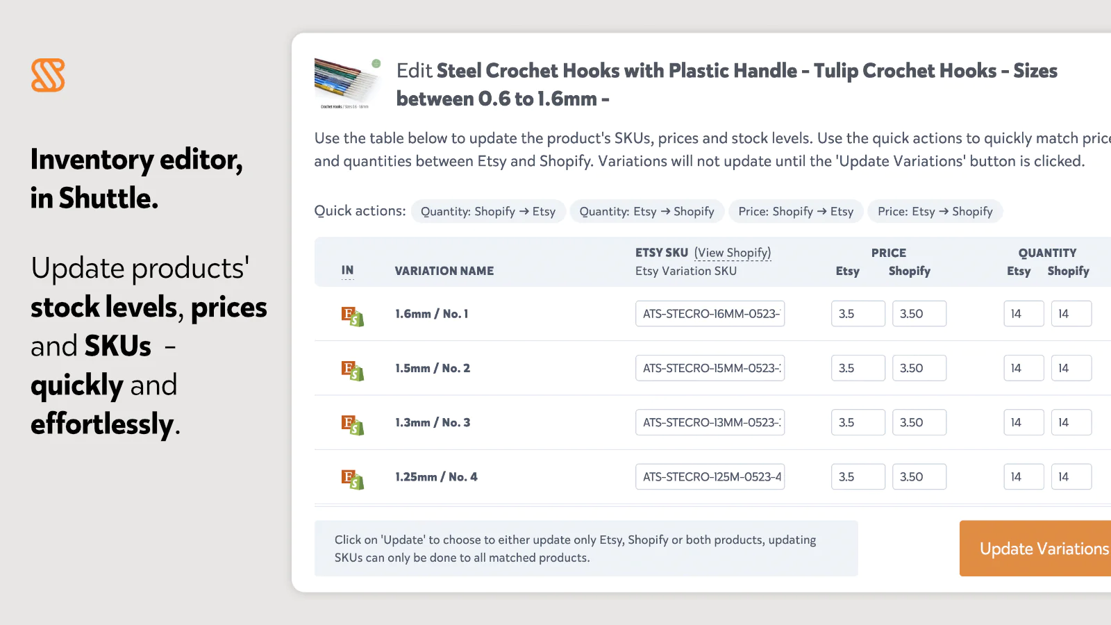 Shuttle integrates with Etsy and Shopify’s inventory management systems, so you never have to worry about messy CSV files, missing products, variations, or incorrect transfers.