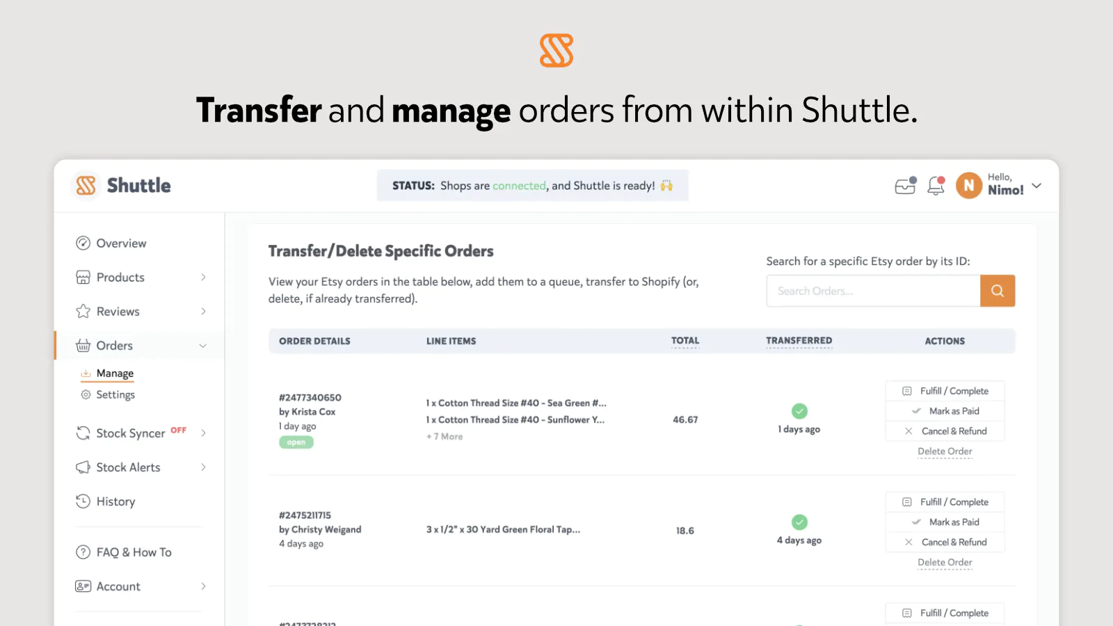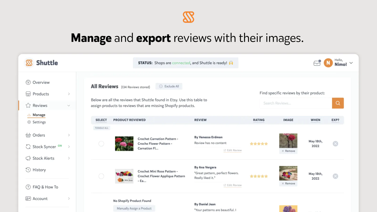 Save Time, Automate Everything : Save precious time by letting Shuttle automatically transfer your new products, reviews and orders (with auto-fulfillment).