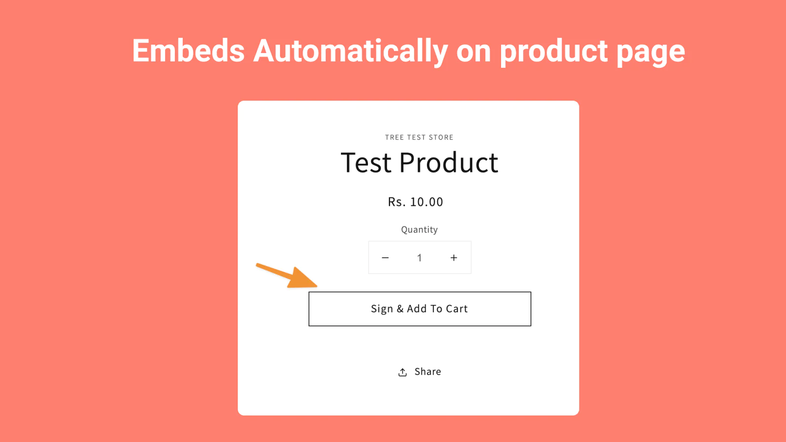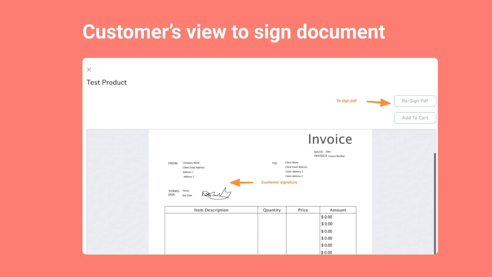 Connect products to the document and SignPanda automatically embeds into the product’s page. Customers have to sign the document to add the product to the cart.