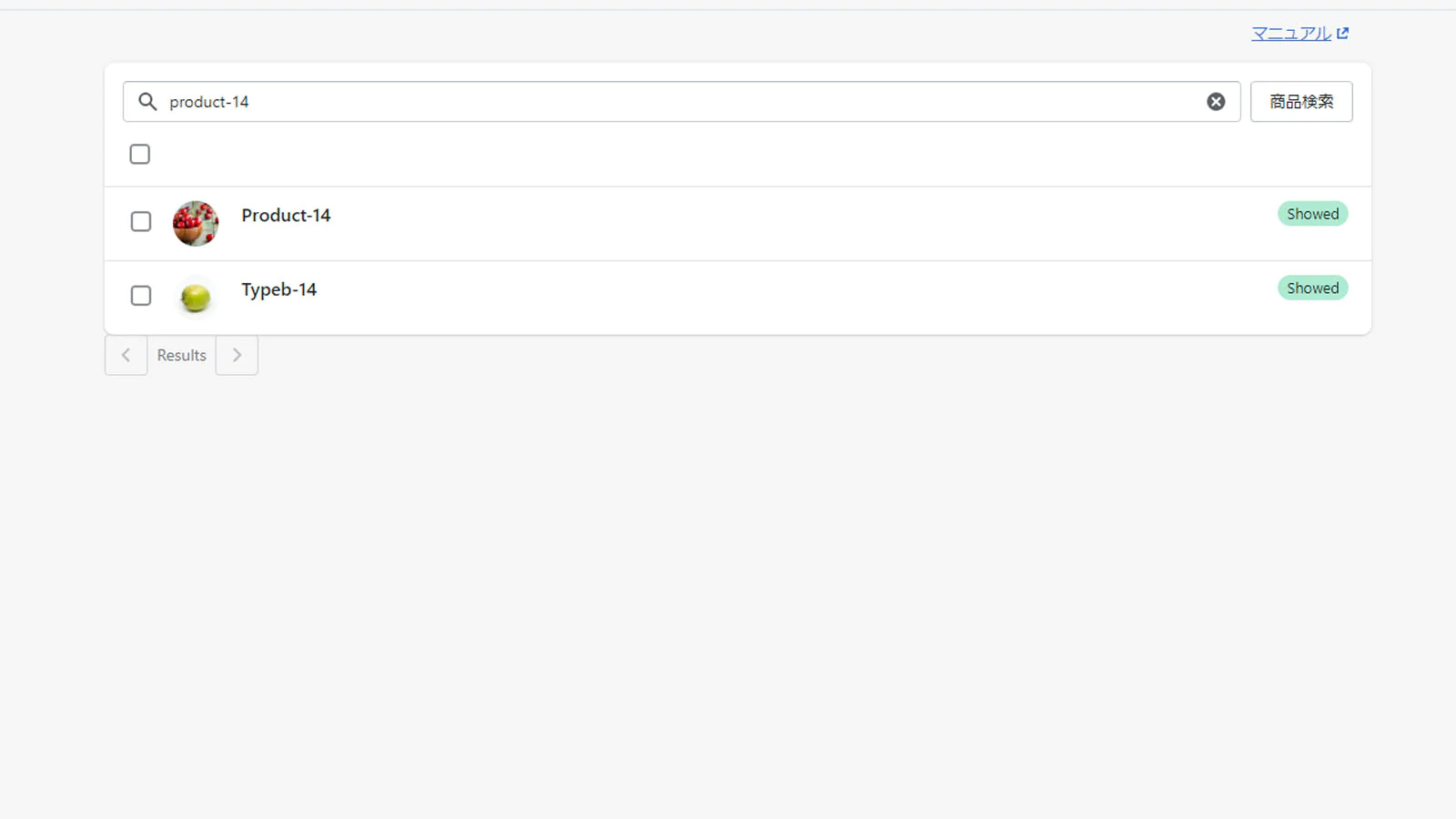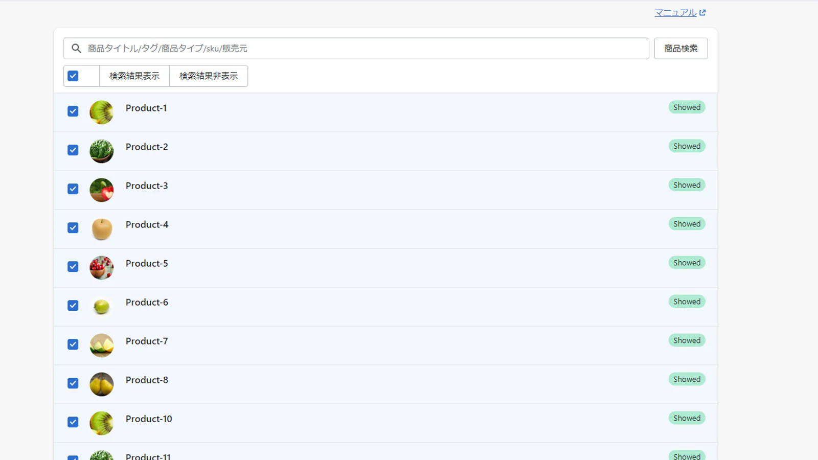 アプリ管理画面で、対象商品をチェックボックスで選択し、検索結果表示/非表示の切り替えにより、ショップ内検索結果に該当商品を非表示もしく表示することができます。