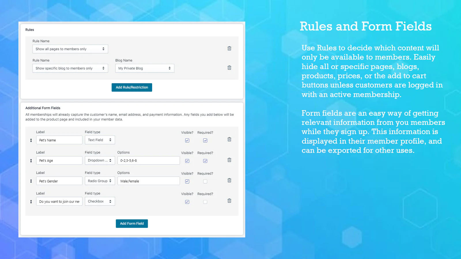 If you want to limit some content on your storefront only to members, Simplee Memberships makes it easy to create rules. Currently, these include pages, blogs, products, and collections. You can even restrict the add to cart button, and hide prices from non-members.