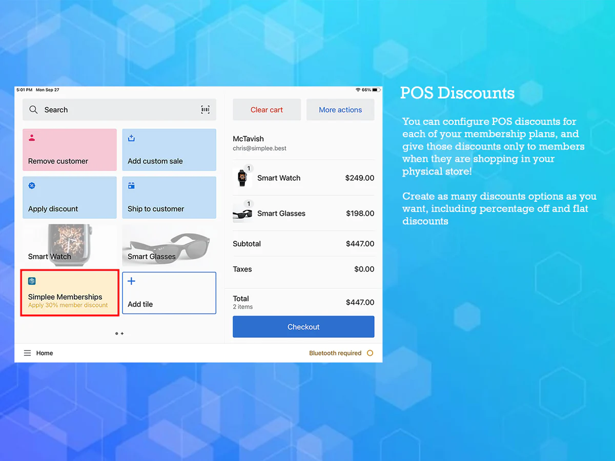 So much extra functionality : Automatic member discount codes, POS integration, failed credit card retries, free trials, setup fees, one-time payments & more!