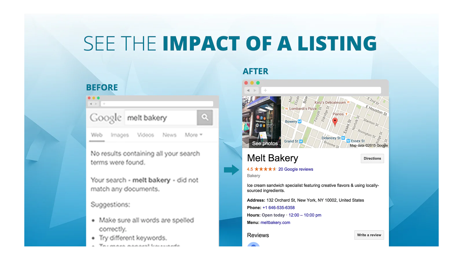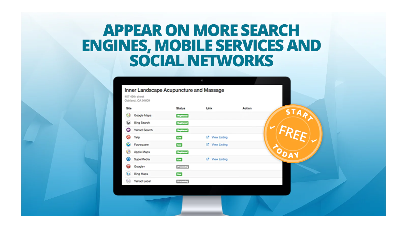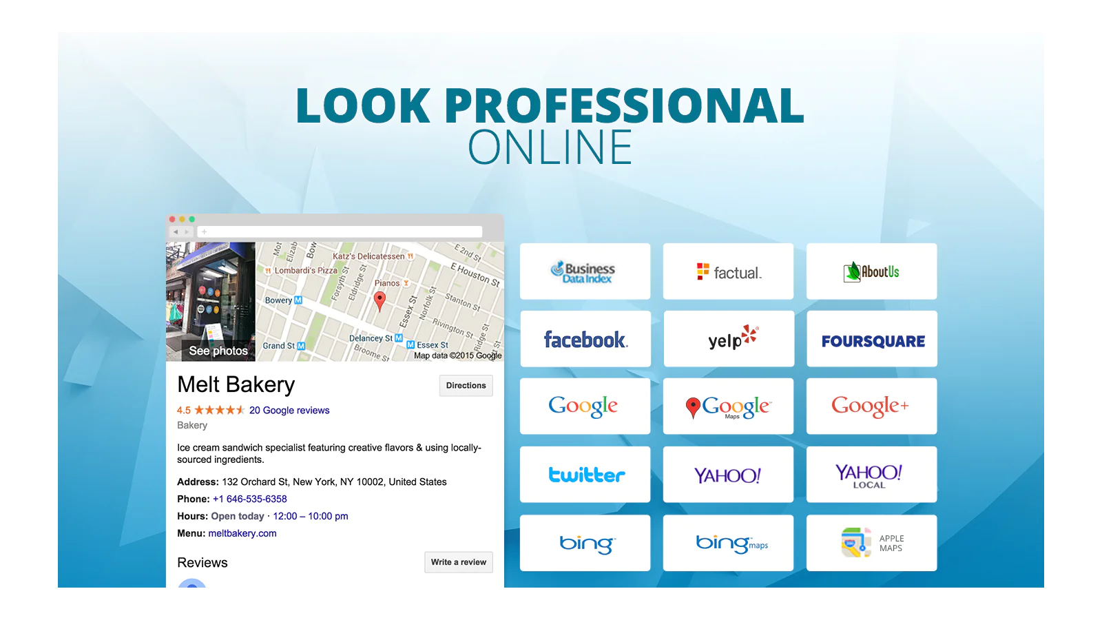 Are you on the map? : We show your address, hours and phone number in places like Google Maps, Bing Maps, Yelp, FourSquare, Yahoo! Maps and more