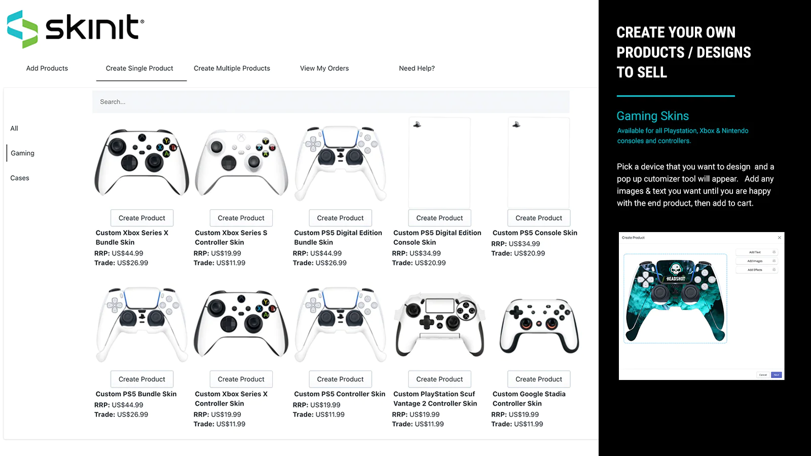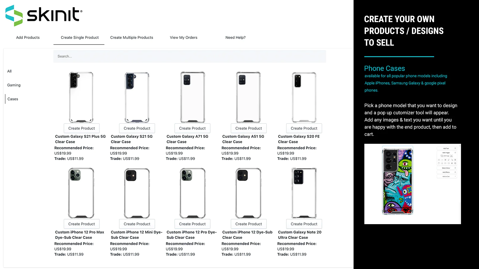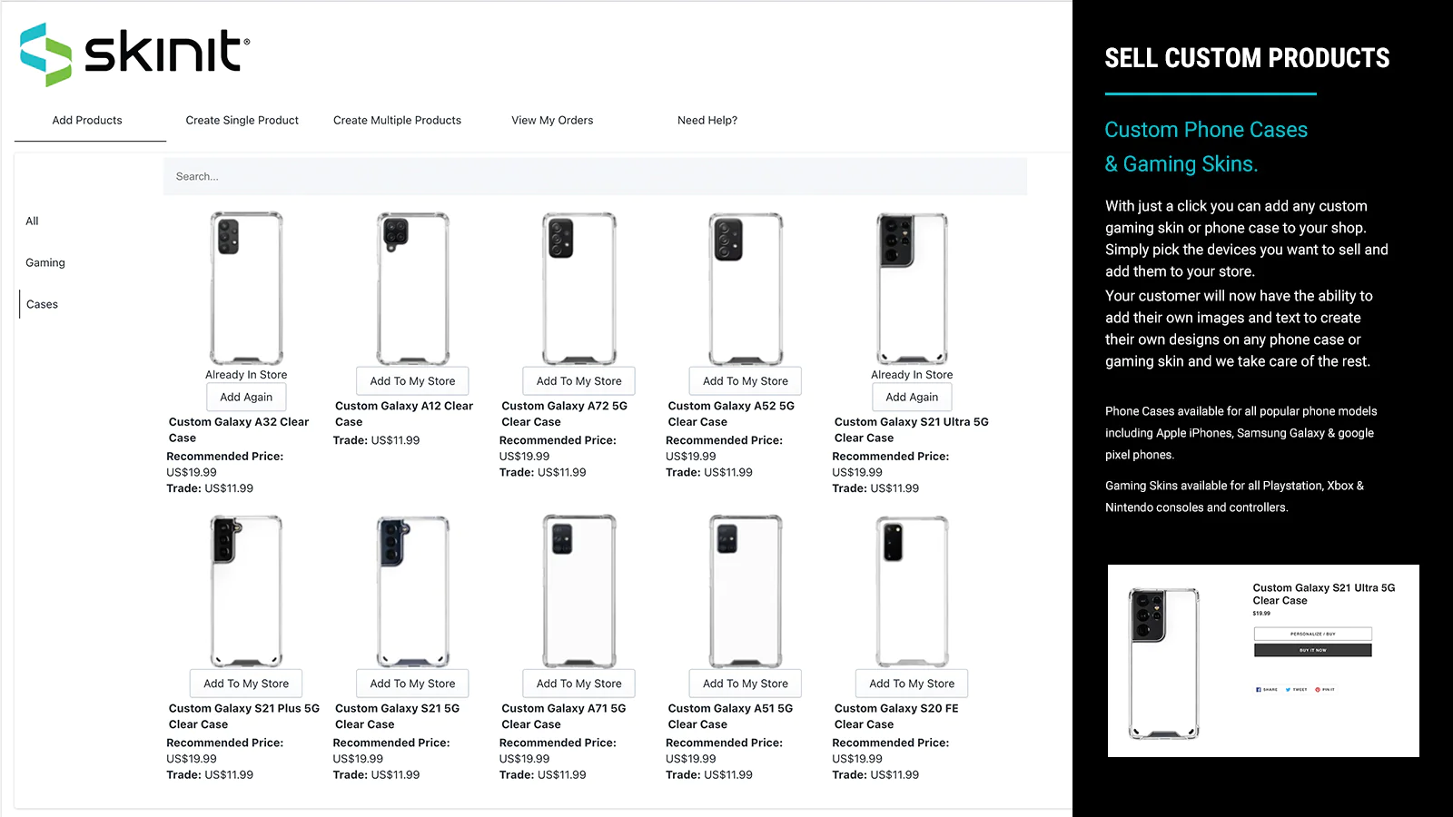 Begin by importing the products you'd like to offer or create your own. Set your product pricing to achieve your desired profit margin and edit other product information you'd like to share with your customers. When a customer places an order, it is automatically sent to Skinit within minutes and sent to production.