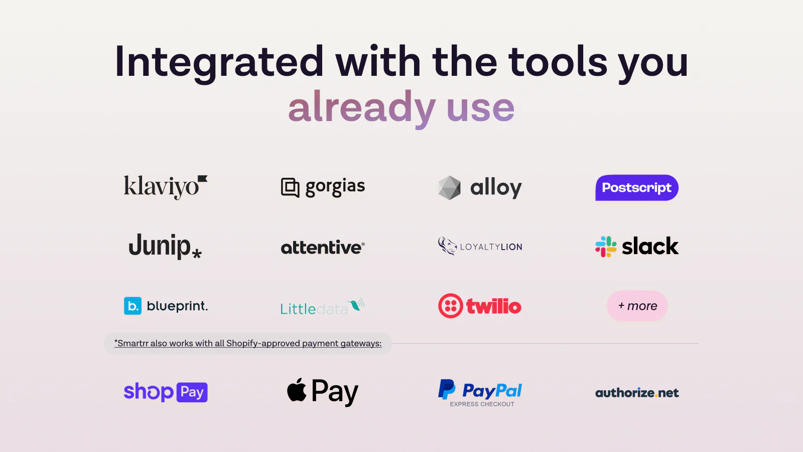 On Grow plans and above, our customer success team will fully manage the steps needed to install Smartrr, migrate seamlessly, and guide you through our best practices to set up an optimal subscription experience for your customers. For select plans, your dedicated CSM will partner with you beyond onboarding for on-going success.