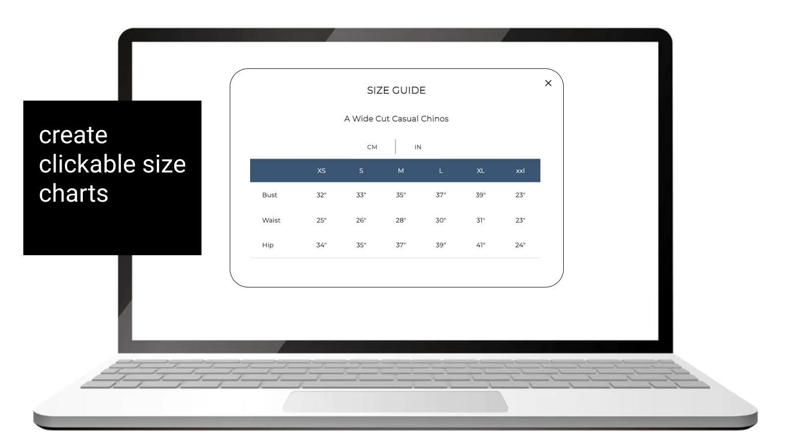Perfect visuals : Surprise your customers with a sleek, beautiful and responsive design. Users can interact with your size charts to find the right size.