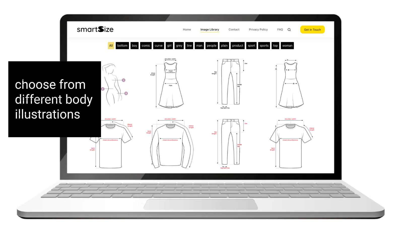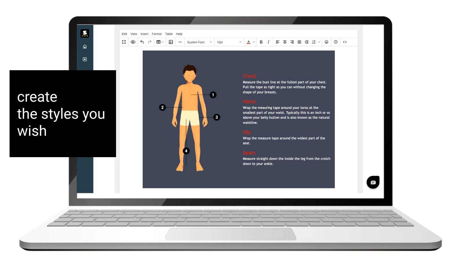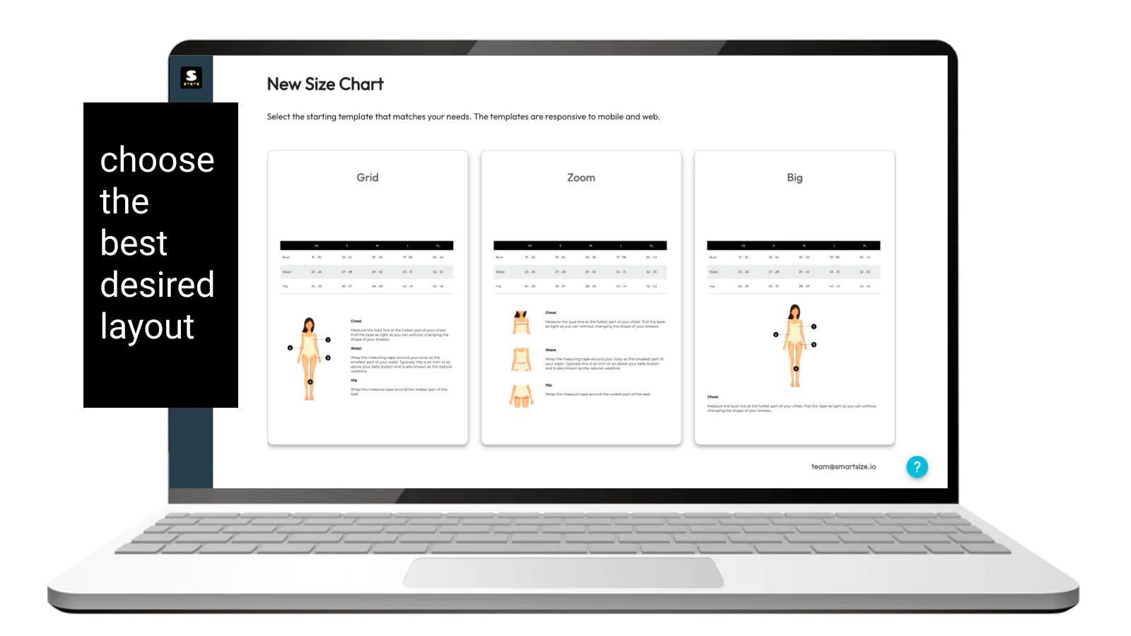 One minute size chart : Create very fast the size chart you need using pre-defined templates. Add SmartSize images and measurement instructions.