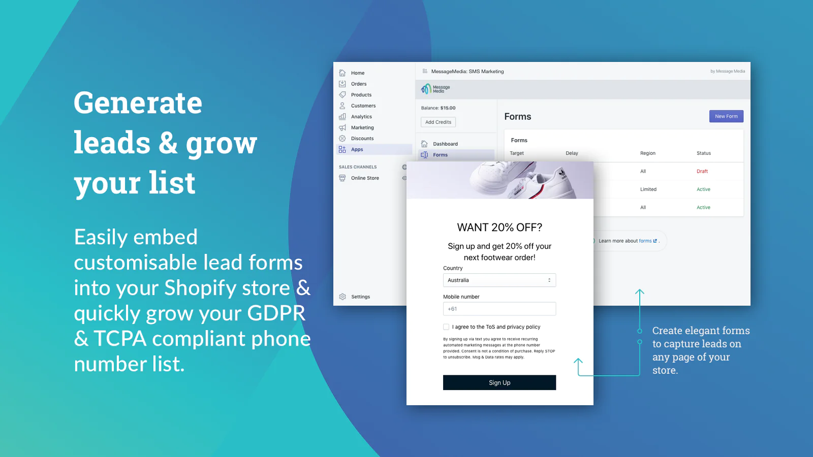 Display a mobile-friendly pop-up form and collect mobile numbers to build your SMS subscription list. Customise templates with your branding and call-to-action within the platform. Offer special discount codes, alerts, or loyalty points to start gathering leads.