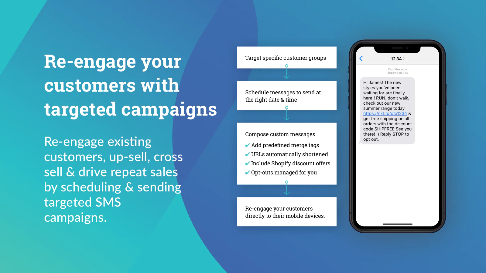 Win customers back with SMS. Send reminders, special offers, free shipping or discounts to get prospective buyers to take action. Plus, recover lost sales and boost your ROI.