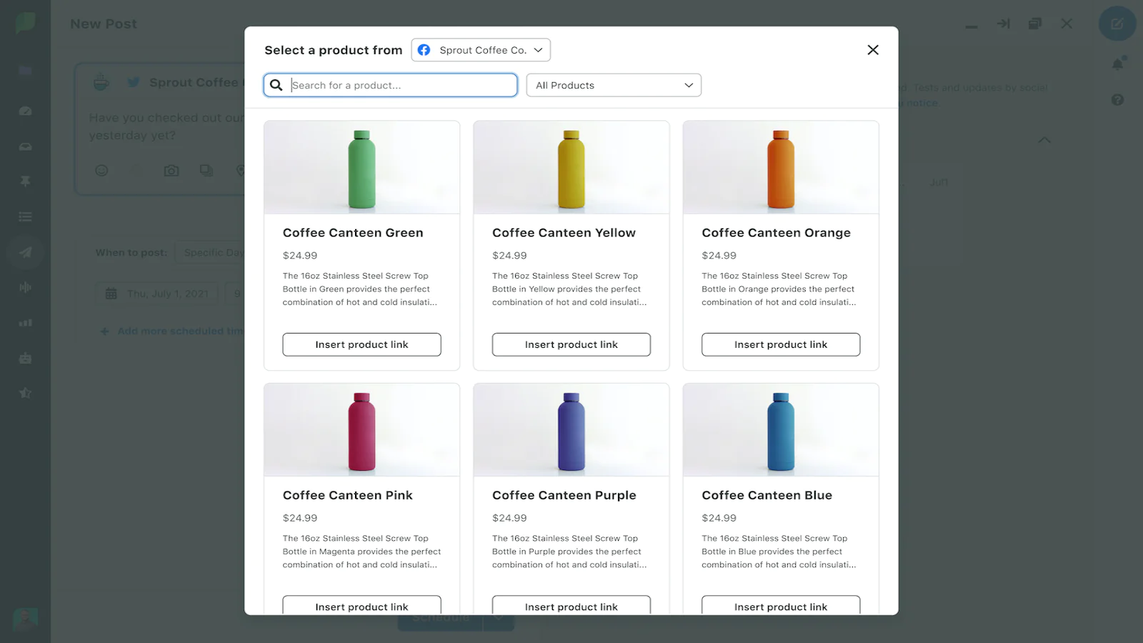 Drive purchases by quickly adding product links to your posts and customer responses. To insert links, open the Sprout Social product picker while replying to a message or composing a social post and select the desired product to send to your audience.