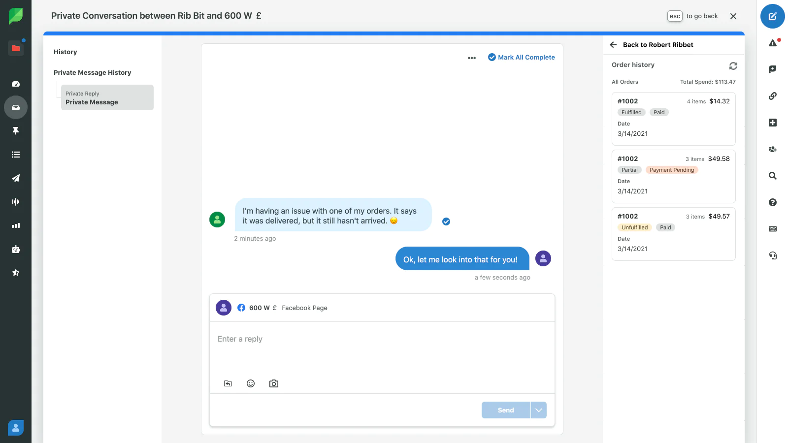 Manage your customer order inquiries coming through social media by linking and viewing customer and order details alongside incoming messages from customers’ social accounts.