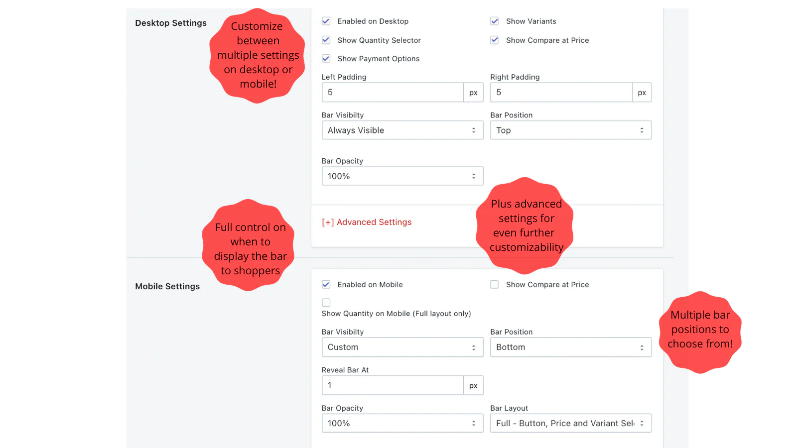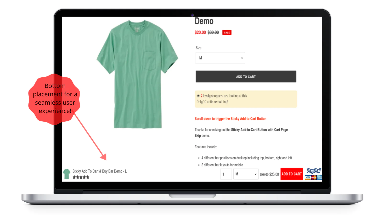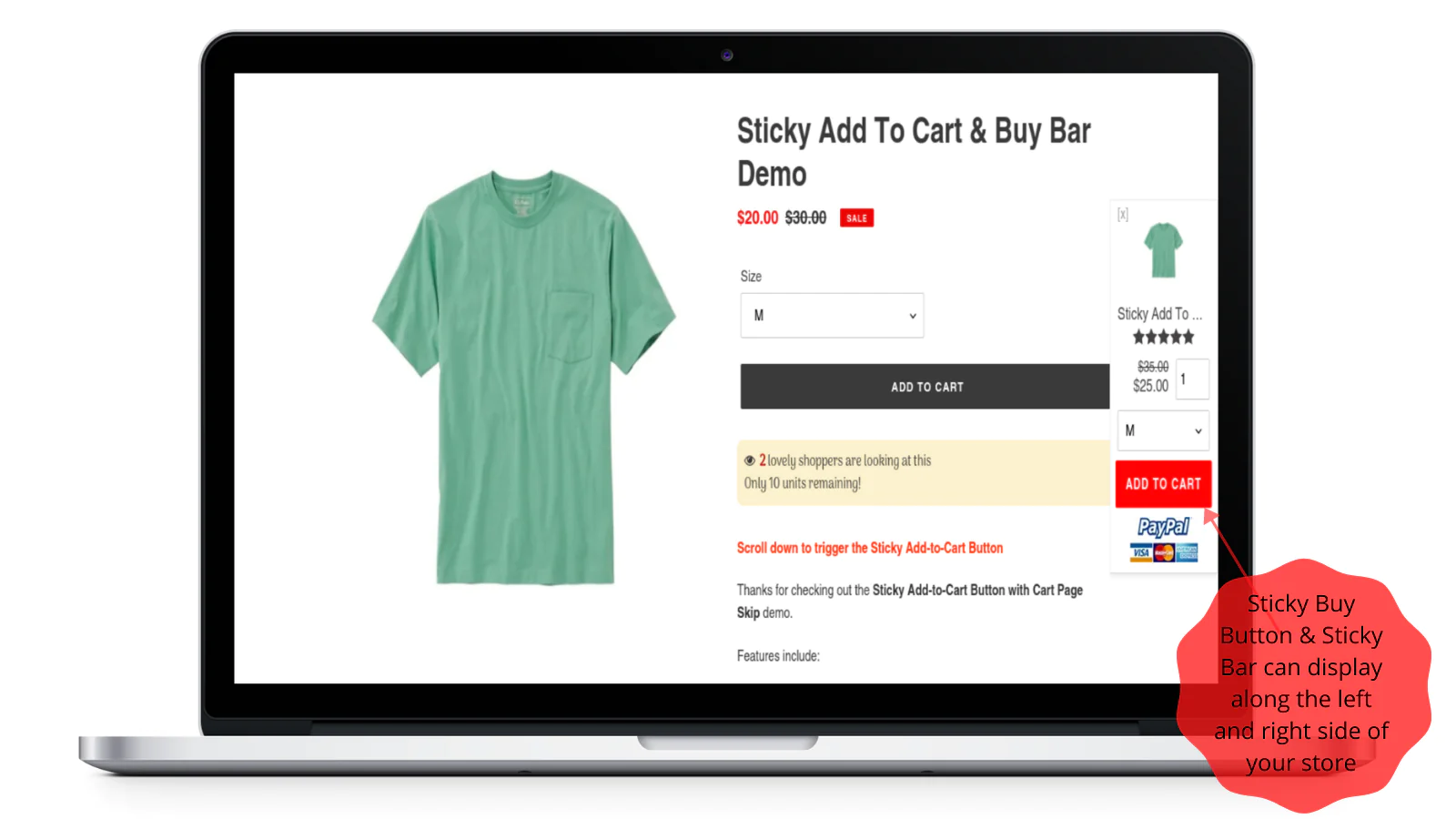 Sticky Buy Button & Sticky Bar gives your customers a better user-experience while allowing them to immediately act upon their decision to buy. It's always visible and ready for clicking.
