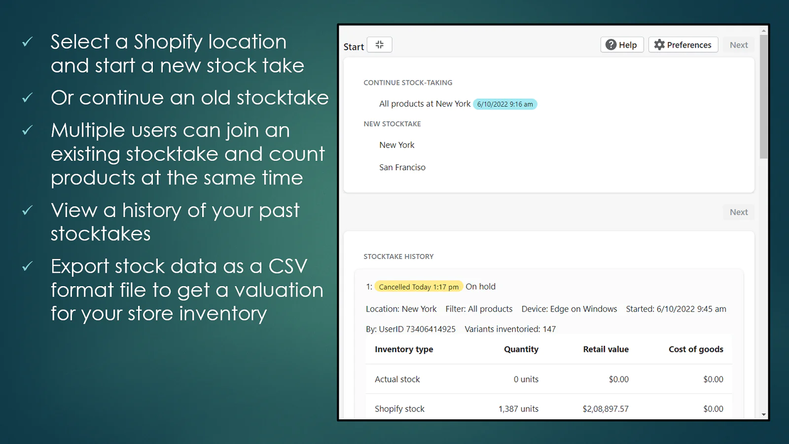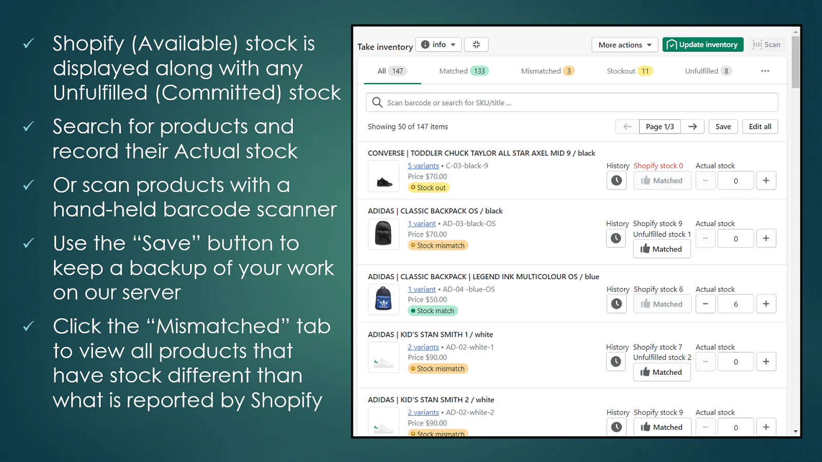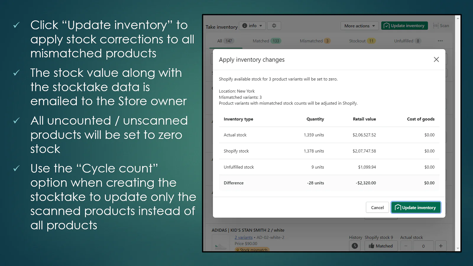 Take charge of your inventory : View your stock value, mismatched stock, & stockouts as you take inventory. Once you're done, adjust and fix Shopify inventory errors.