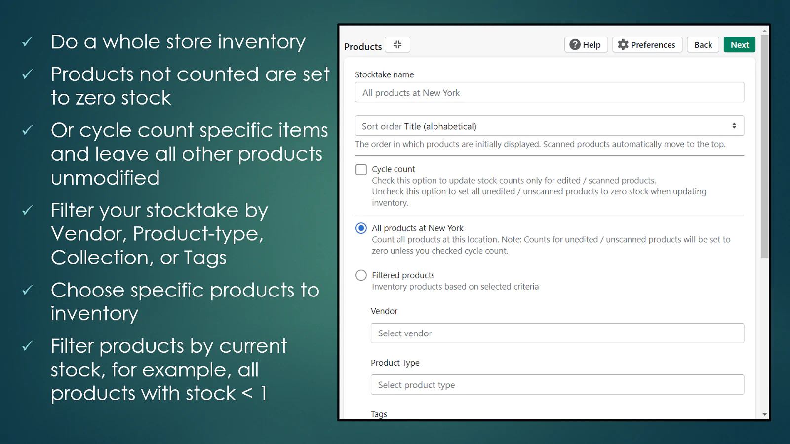 Count everything in your store or filter your inventory and stocktake by Vendor, Product Type, Product Tags, Collections, or Inventory quantity. Do you have a lot of high-value items you want to cycle count frequently? Choose individual products and do a stock count of the selected products or cycle-count just the variants you wish to update.