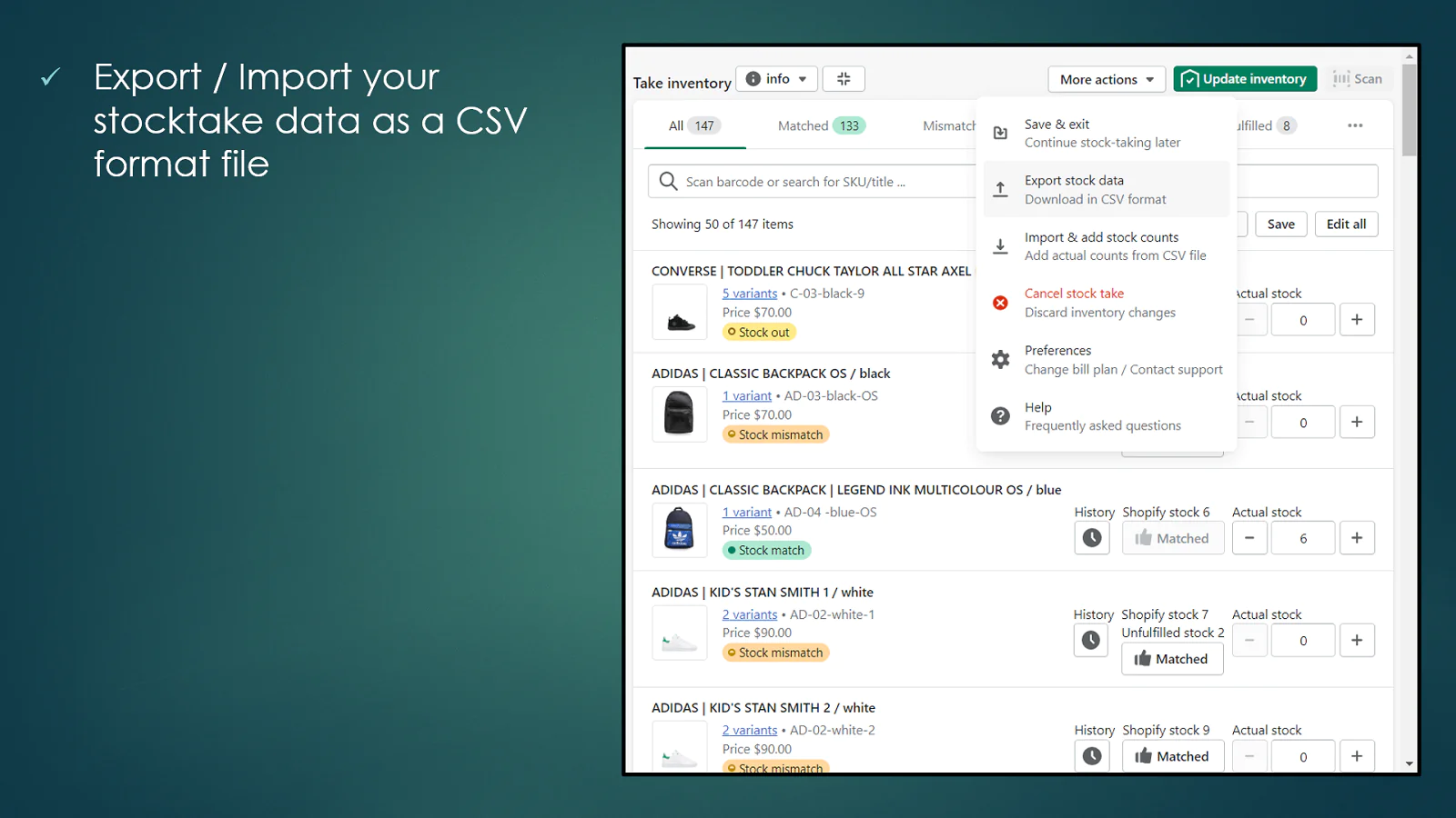 Once your stocktake is complete, apply all inventory count changes to your Shopify store or export your inventory in CSV format. Optionally, you can edit the exported CSV file in Excel and import it back into our Stock Take app before updating inventory. We send the store owner an email of every stock adjustment to help with inventory reconciliation. You can also use the CSV file to undo your stock changes and restore your old stock counts.