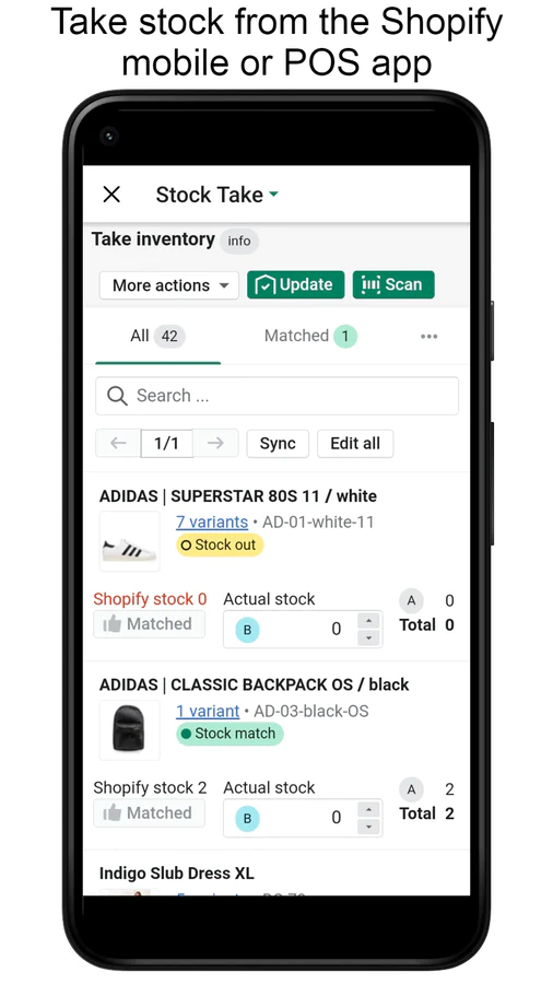 Take inventory in your browser by scanning barcodes with a scanner or directly in the Shopify mobile or POS app with your Apple or Android device camera. Unlike other stocktaking apps, you don't need to install a separate barcode scanning app on your device. If you don't use barcodes, you can search by product name, SKU, barcode, vendor, product type, or tags and manually enter the quantity.