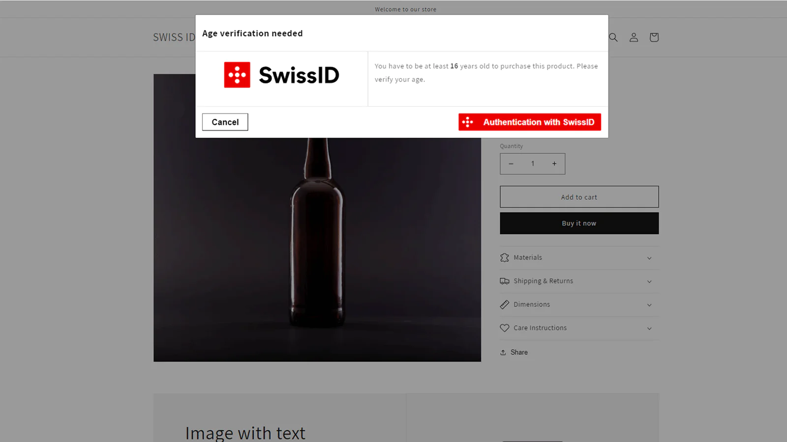Thanks to the secure login with SwissID, customers can easily register and log in to your online shop. If necessary, online shops also benefit from identities that have already been checked, e.g. to ensure an age check. After you have installed the app, you can configure it using your SwissID partner details so the SwissID login and/or age verification can be enabled. The age verification can be enabled on specified products or complete collections. Simple installation simply stores the desired configuration in the app settings. Please note that a signed partner contract with SwissSign must be available in order to use the SwissID Shopify app.
