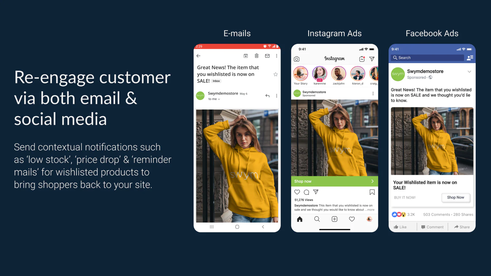 Bring Shoppers Back : Drive traffic and sales with personalized email and social campaigns based on wishlist activity. Send emails via your ESP.