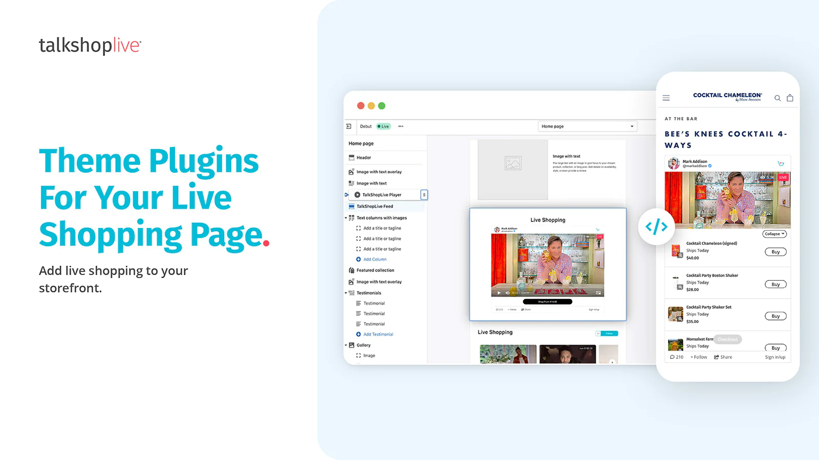 Our app comes with your own live shopping page. And with our TalkShopLive Feed or TalkShopLive Player theme sections, you can include live shopping on any of your website’s pages. Best of all, you don’t need a TalkShopLive channel to use our new theme sections.