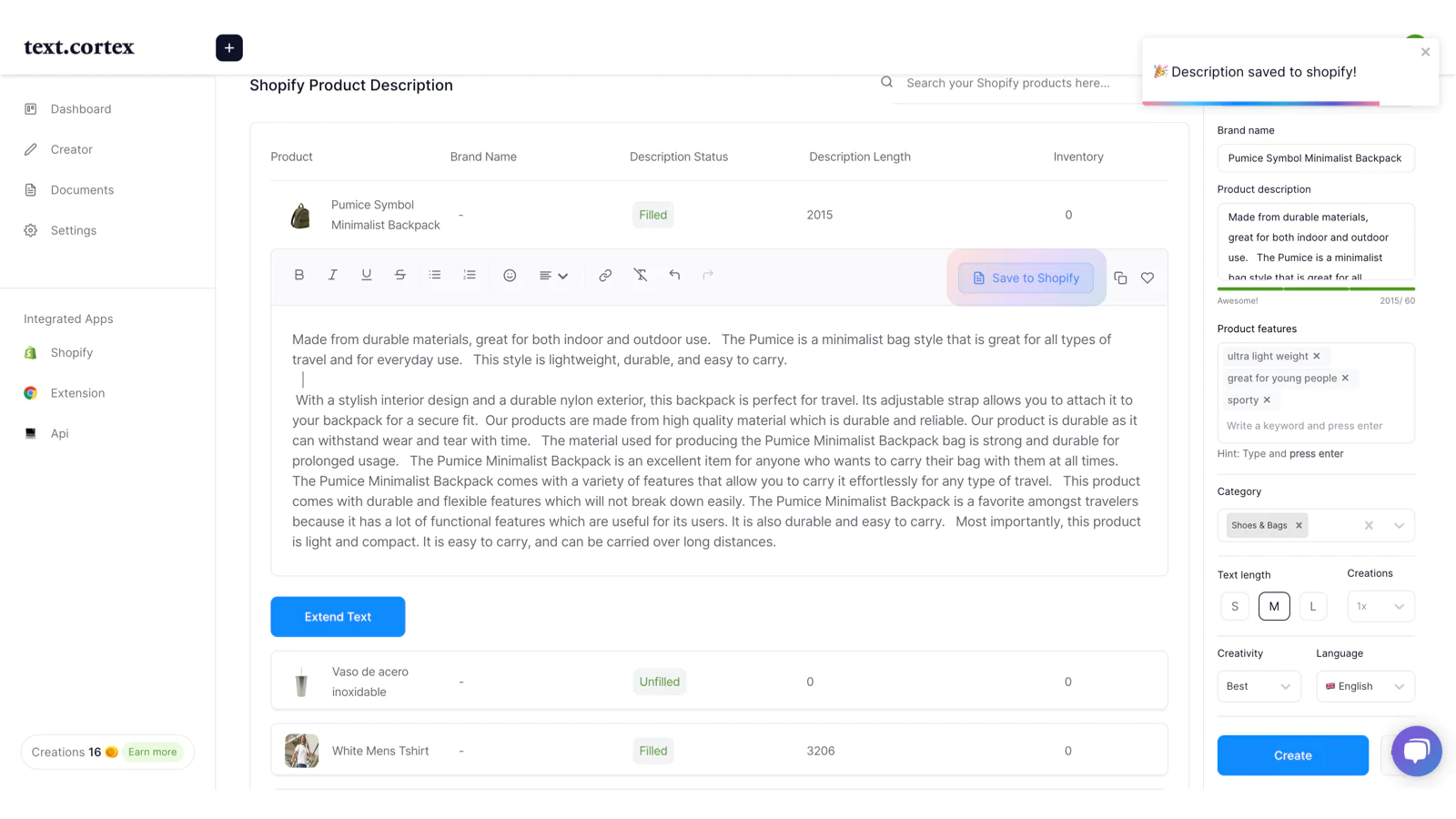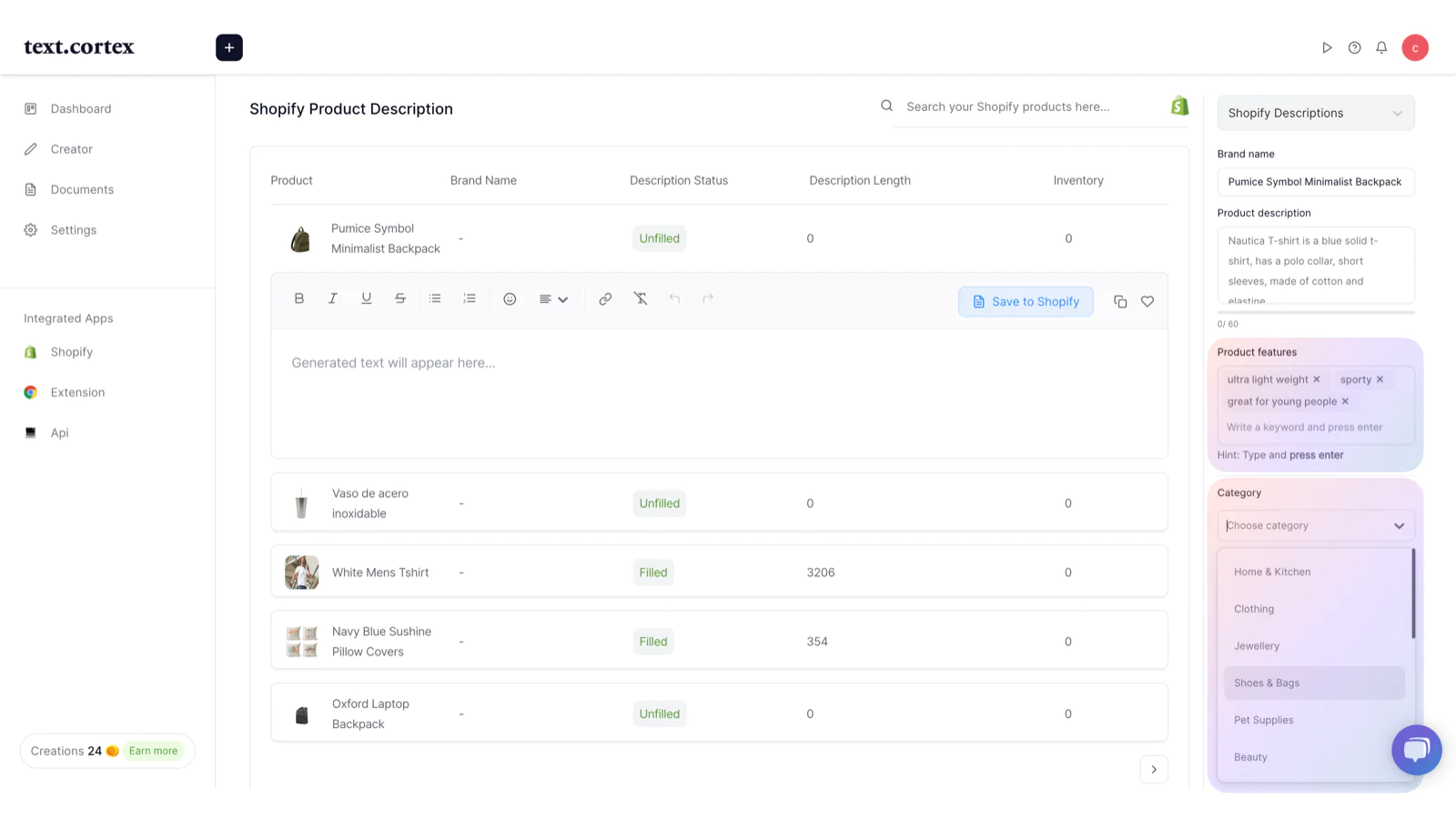 Generate Product Descriptions : TextCortex uses its advanced AI to generate dozens of Product Descriptions in seconds. Each one of them are unique and ready to use.