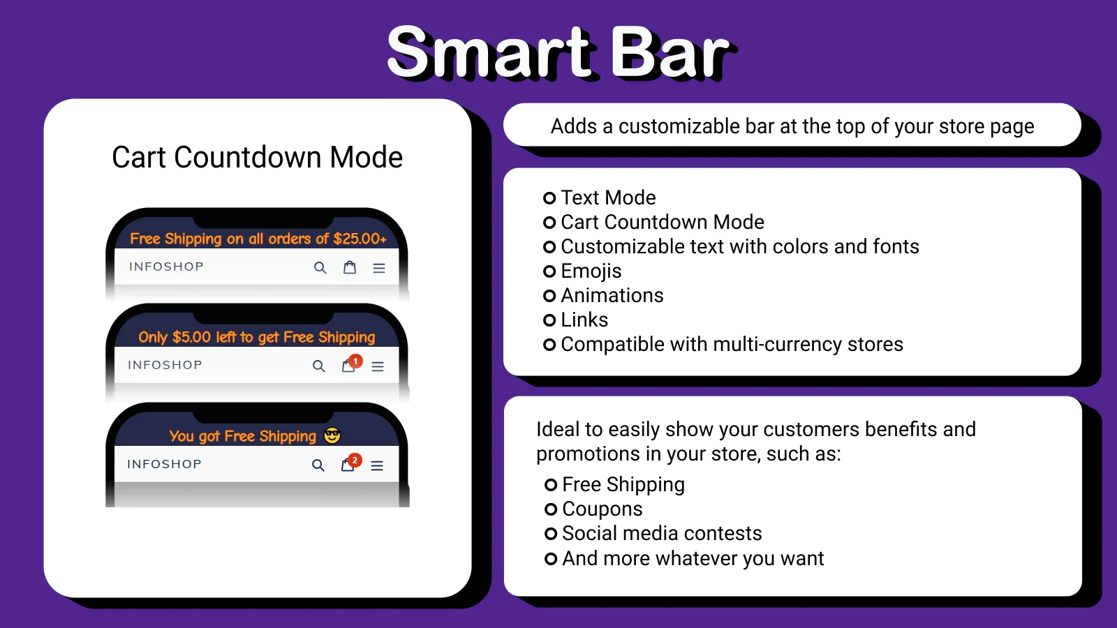 Adds a customizable top bar at your store, where you can set up customized fonts, colors, sizes, emojis, links, animations, etc. The Smart Bar has two modes: