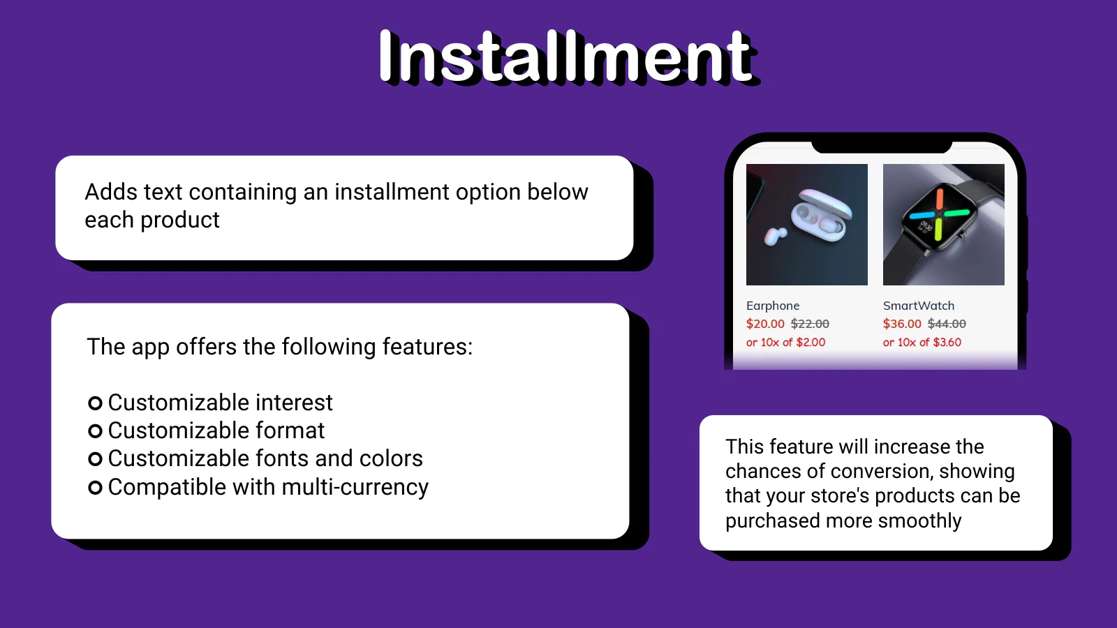 Adds a customized installment text in each product of the page, based on your configured number of installments and interest.
