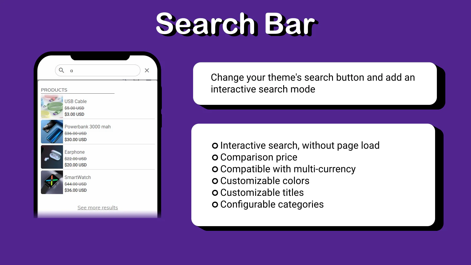 Modify your store's search button and adds an interactive and customizable search mode, where your customers can look quickly and easily at the products in your store.