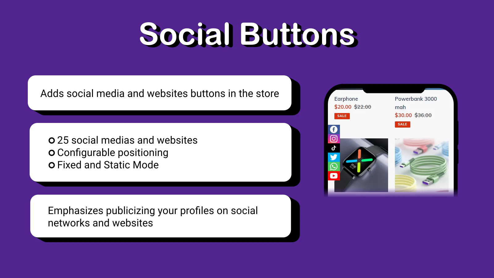Adds configurable buttons of social media and sites to your store page. With 25 websites and social media options.