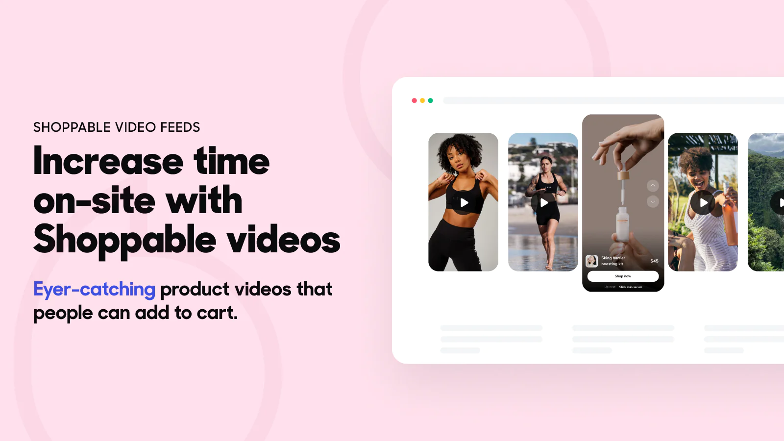 Shoppable videos that sell : Sell more by adding shoppable video feeds (just like TikTok), video reviews, on-site chatbots, shoppable video galleries to your site.