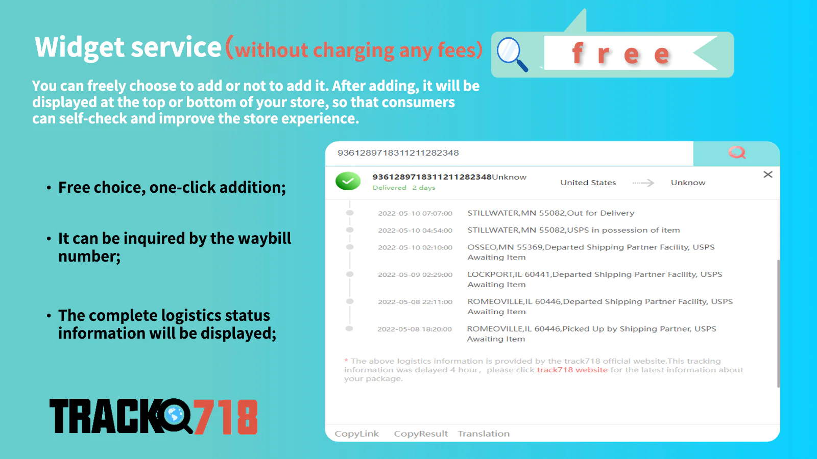 Free email push and widget : Email push: unlimited, trigger automatic push according to package status;Small plug-in: free installation, realize the function of trackin