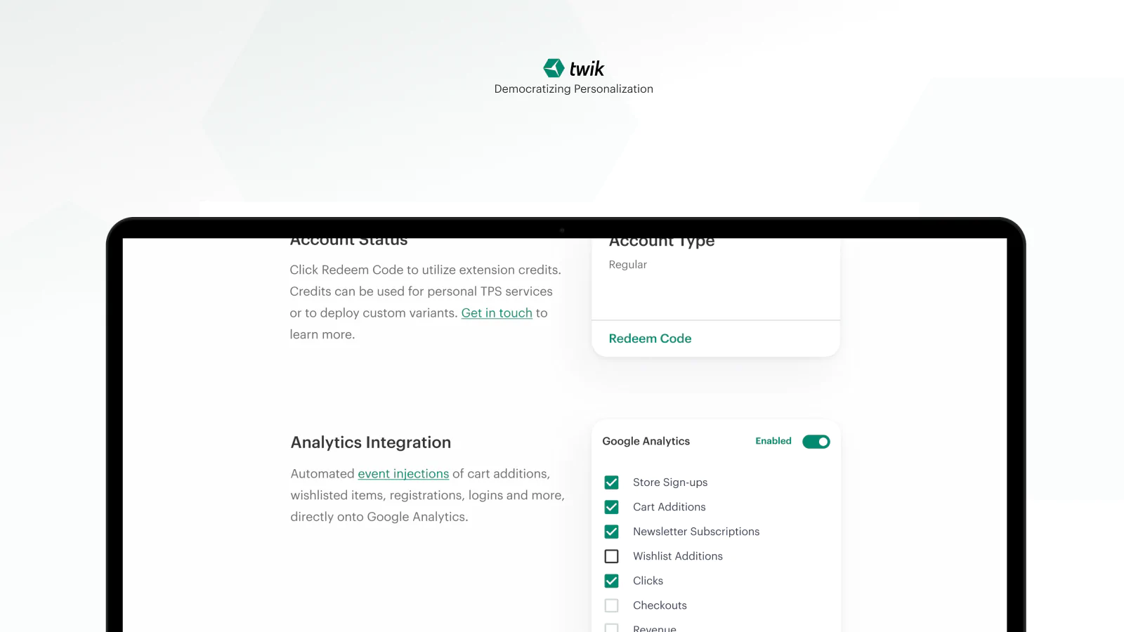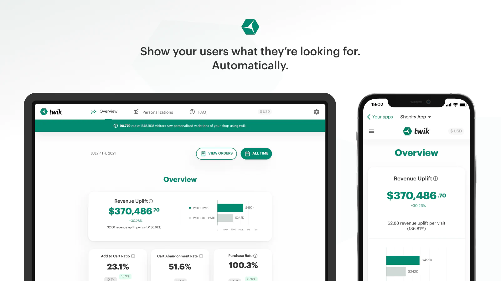 Twik offers a way to increase your sales, without increasing your traffic. No configuration, no editing, no drag-and-drop, and no changing or adding code. All you need to do is add the app, approve the desired personalizations for your visitors, and you’re all done. Twik is also cookie-free; The app uses proprietary technology instead of cookies, to pinpoint users, providing a more accurate and GDPR-compliant user tracking.