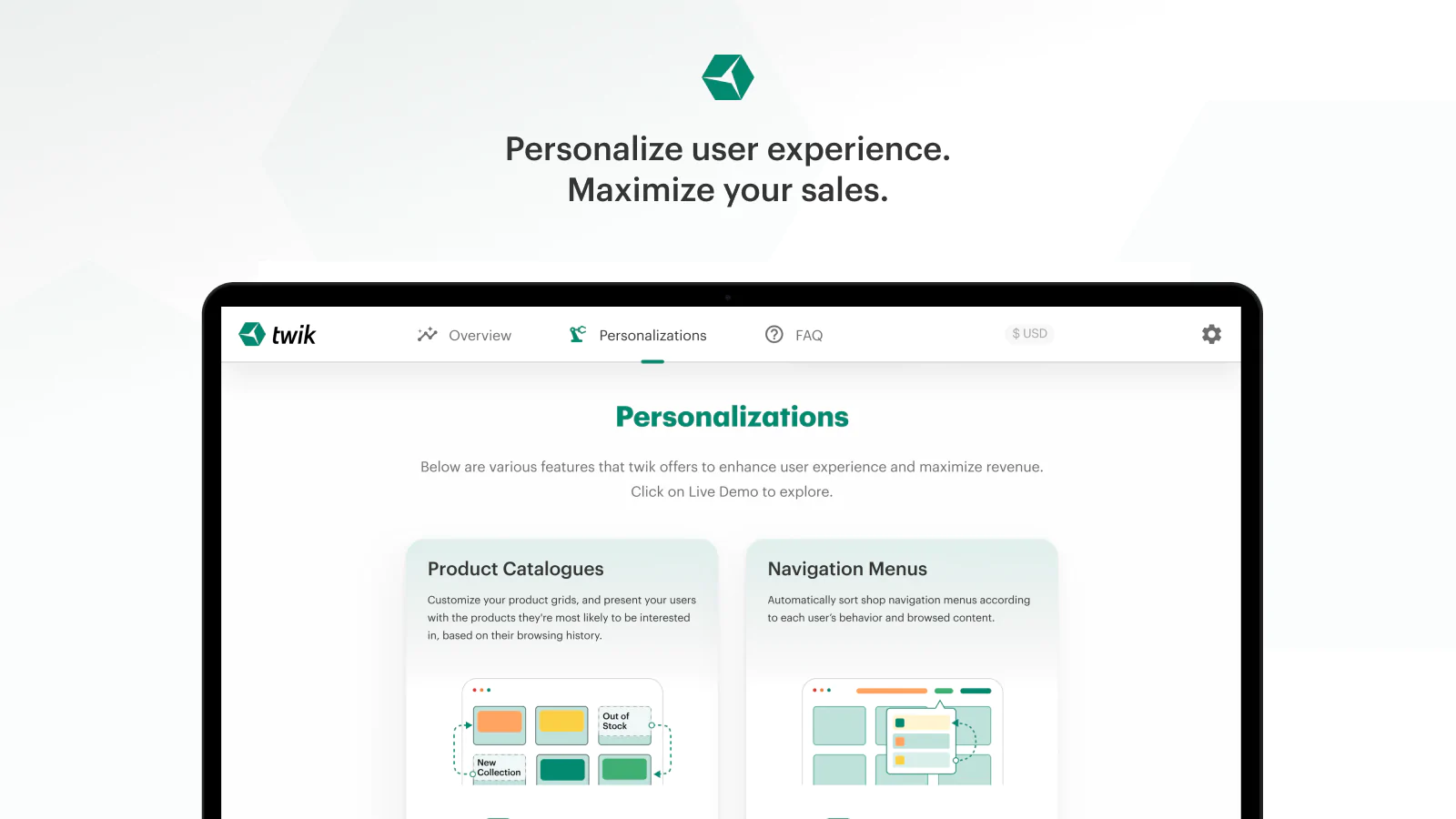 Personalize Menus and Products : Twik reorganizes products, navigation menus, localizes currencies, and more. We present each of your visitors with personalized UX.